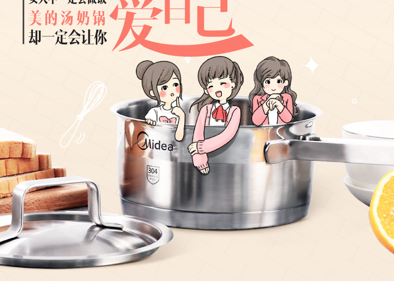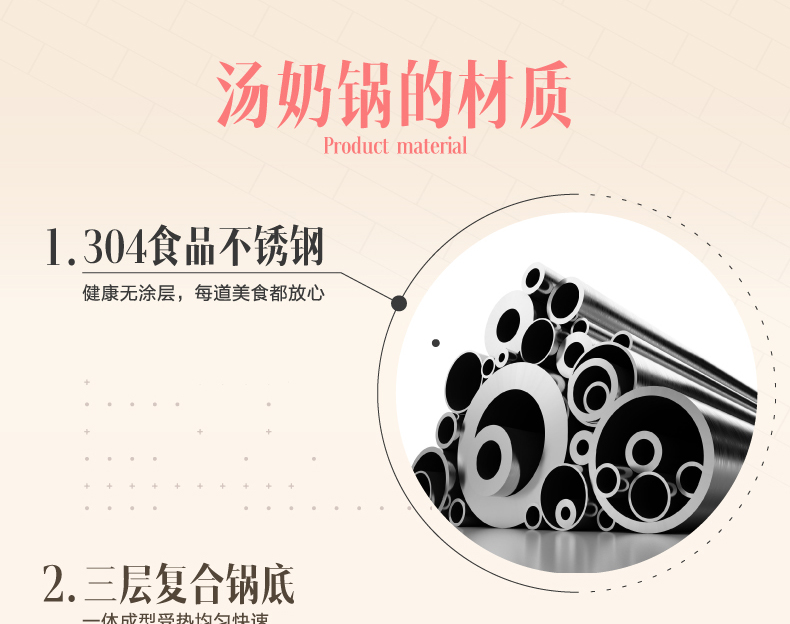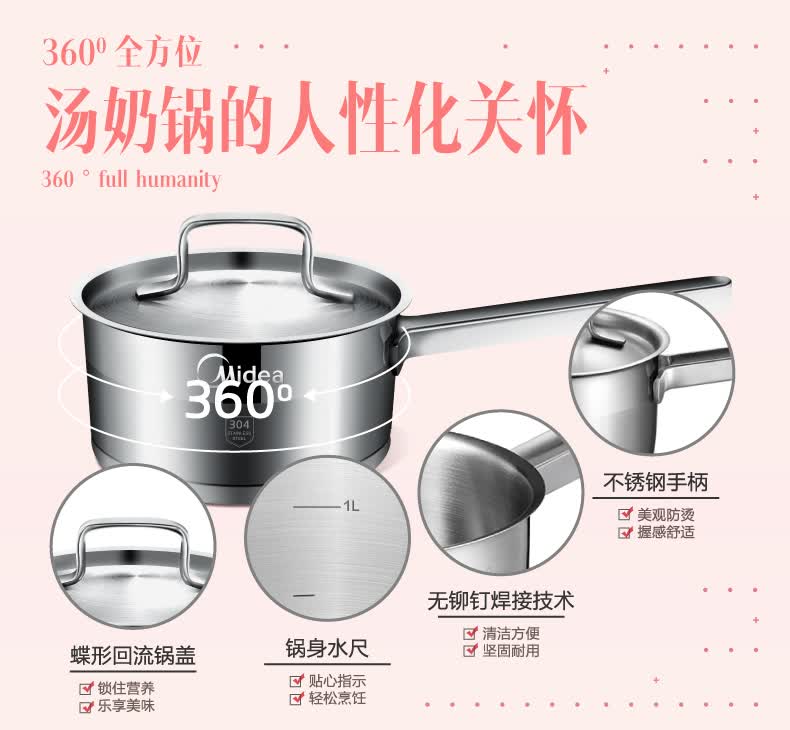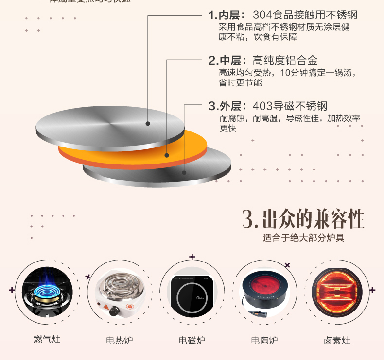 1.304食品接触专用不锈钢,安全健康,久用如新; 2.高强度复合底技术,燃气电磁炉通用; 3.全不锈钢双色抛光,美观大方,品质生活; 4.锅内无铆钉,易清洁一抹净; 5.三层复合底,受热均匀,导热快。