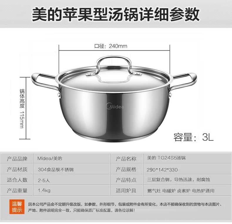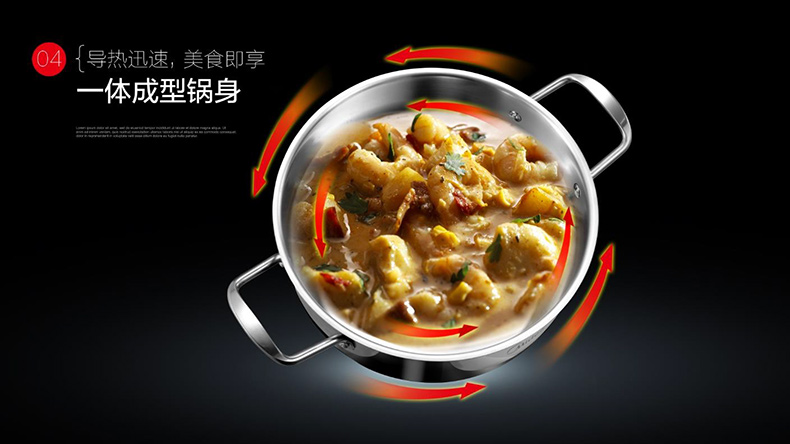 1.304食品接触专用不锈钢,安全健康,久用如新; 2.高强度复合底技术,燃气电磁炉通用; 3.全不锈钢机身设计,美观大方,品质生活; 4.锅内无铆钉,易清洁一抹净; 5.三层复合底,受热均匀,导热快。