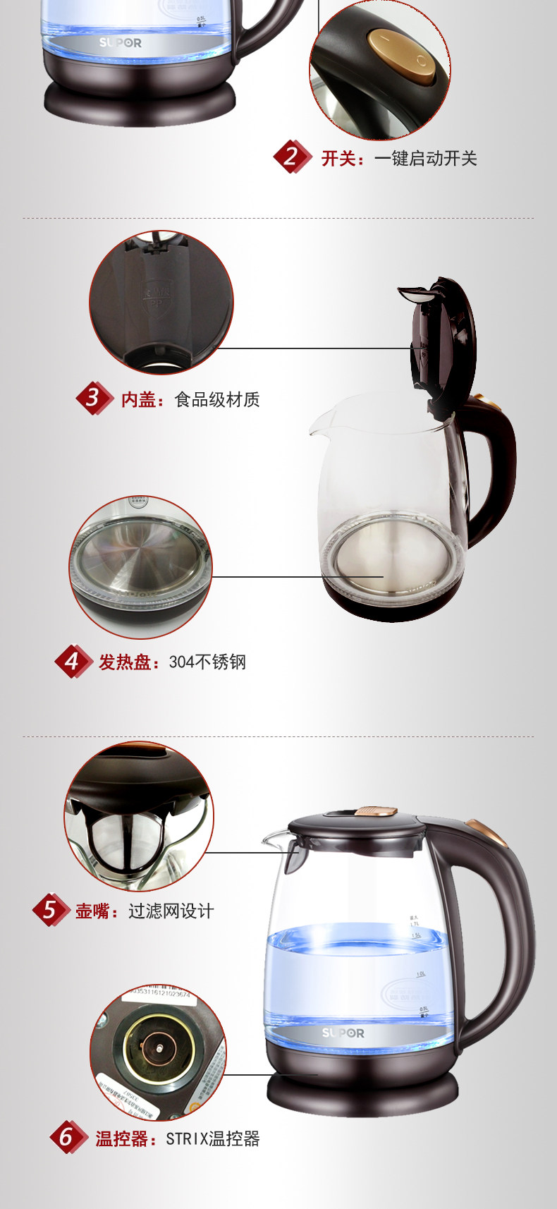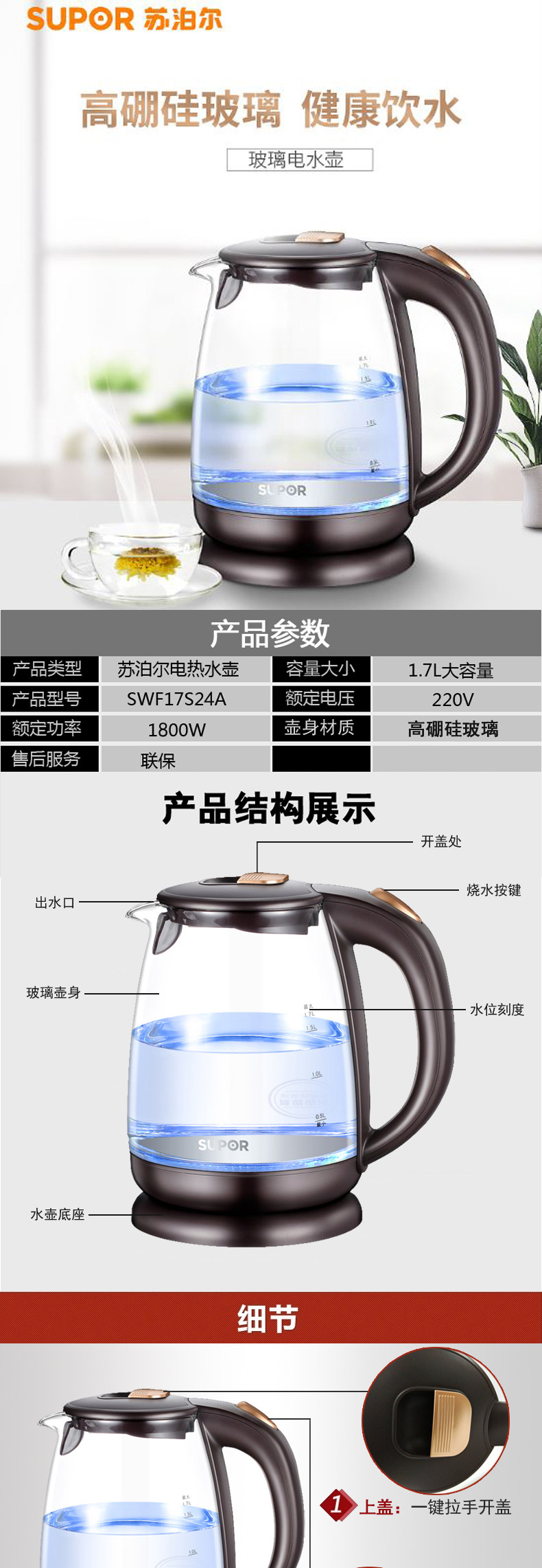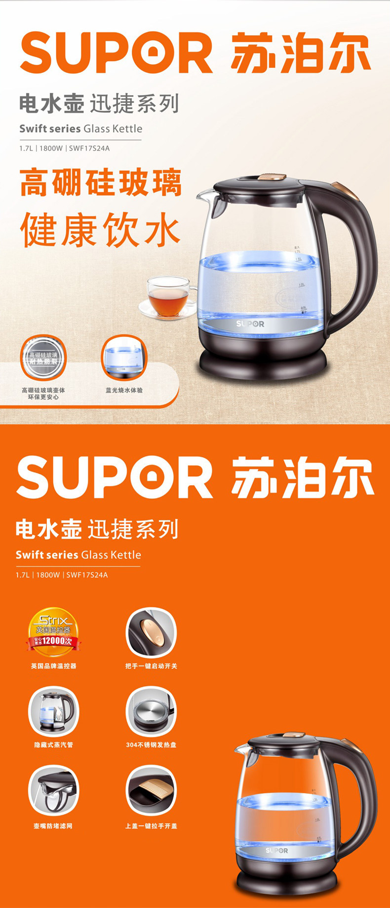 型号:SWF17S24A 容量:1.7L 额定电压:220V 额定功率:1800W 彩盒尺寸:218*198*240MM 包装数量:8PCS 产品重量:1.31KG