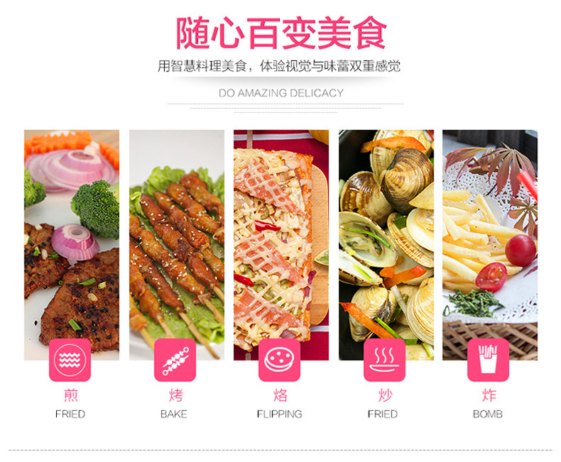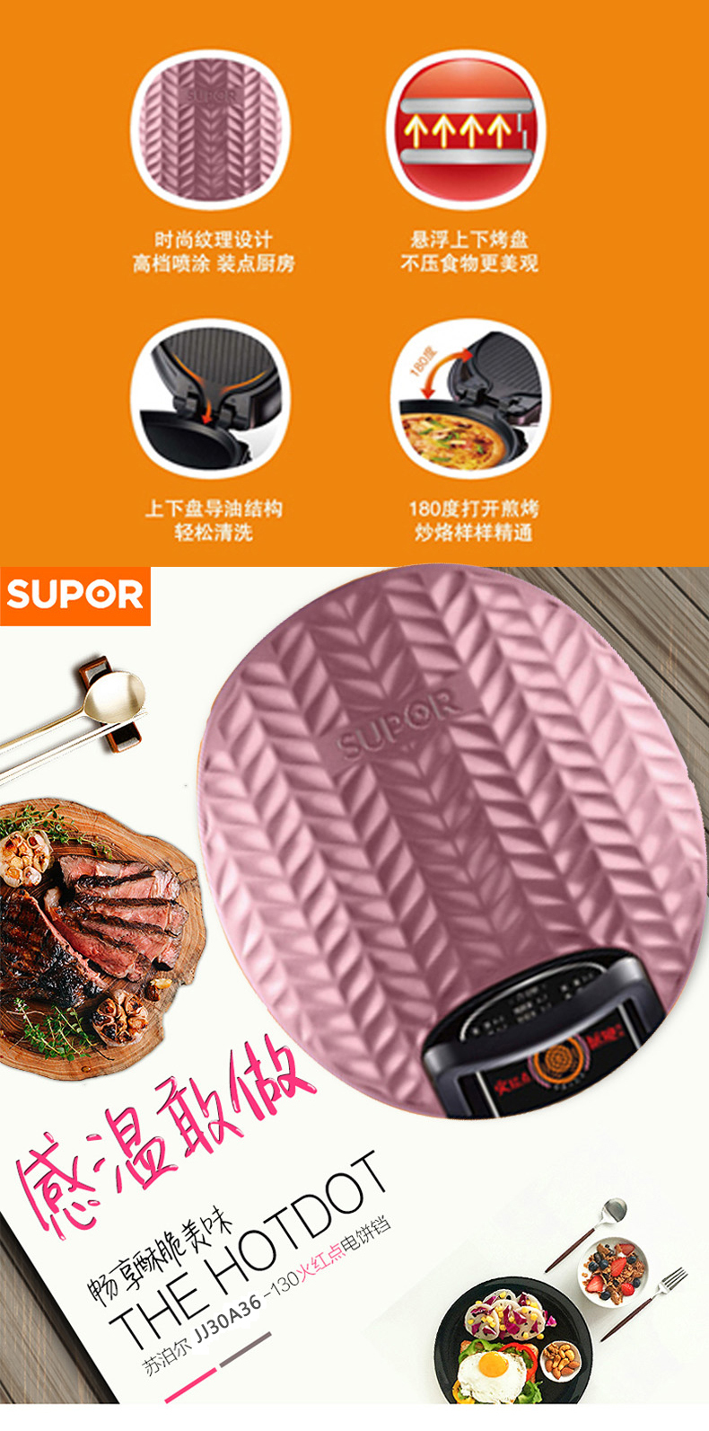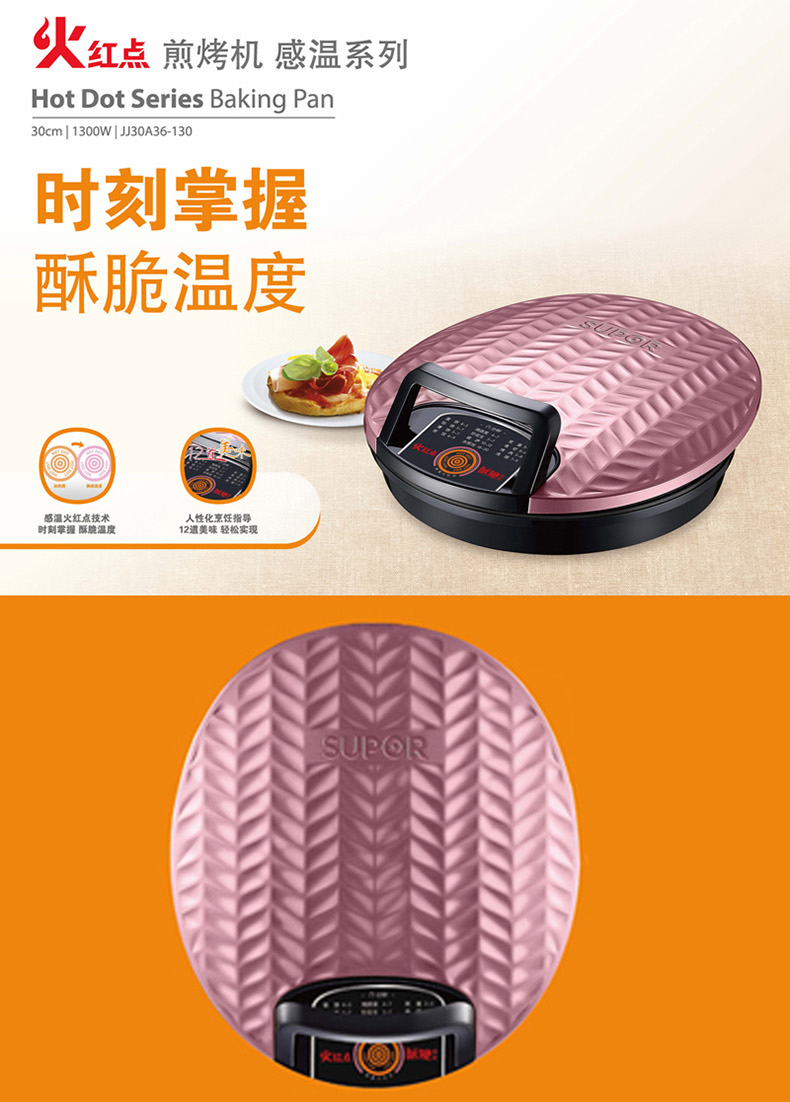 型号:JJ30A36-130 额定电压:220V 额定功率:1300W 彩盒尺寸:388*198*350MM 包装数量:4PCS 产品重量:3.1KG 功能描述: 1.感温火红点技术,时刻掌握酥脆温度; 2.12道食材烹饪指导,轻松实现美味; 3.时尚纹理设计,高档喷漆,装点厨房; 4. 悬浮式上下烤盘,不压食物更美味; 5. 上下烤盘导油结构,轻松清洗; 6. 180°打开煎烤,煎炒烤烙样样行。
