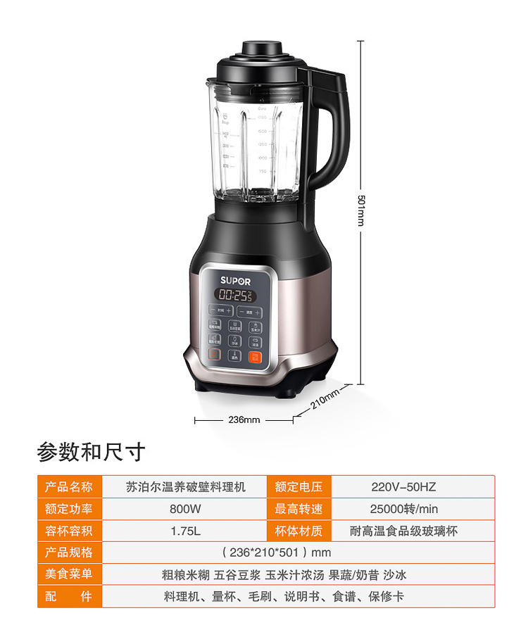 型号:JP13D-800 容量:1.75L 额定电压:220V 额定功率:800W 彩盒尺寸:415*281*365MM 包装数量:2PCS 产品重量:7.3KG 功能描述: 1.一机多用,玩转多种花样美食; 2.大面板触控操作,一键直达; 3.自动清洗,省心方便; 4.优选材质,多重安全保障,安心实用。