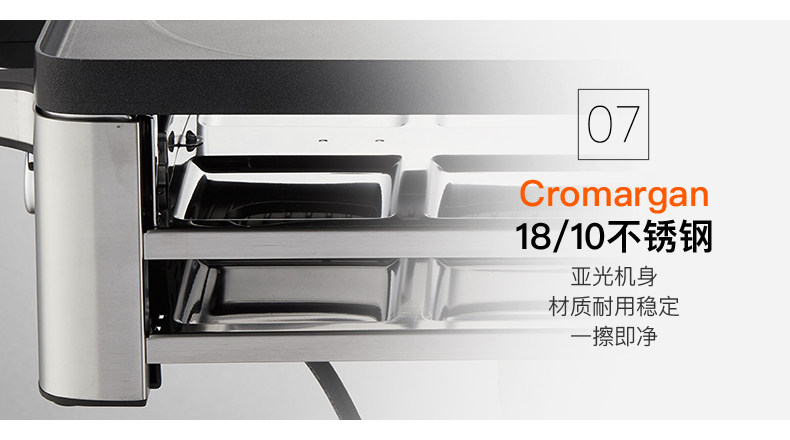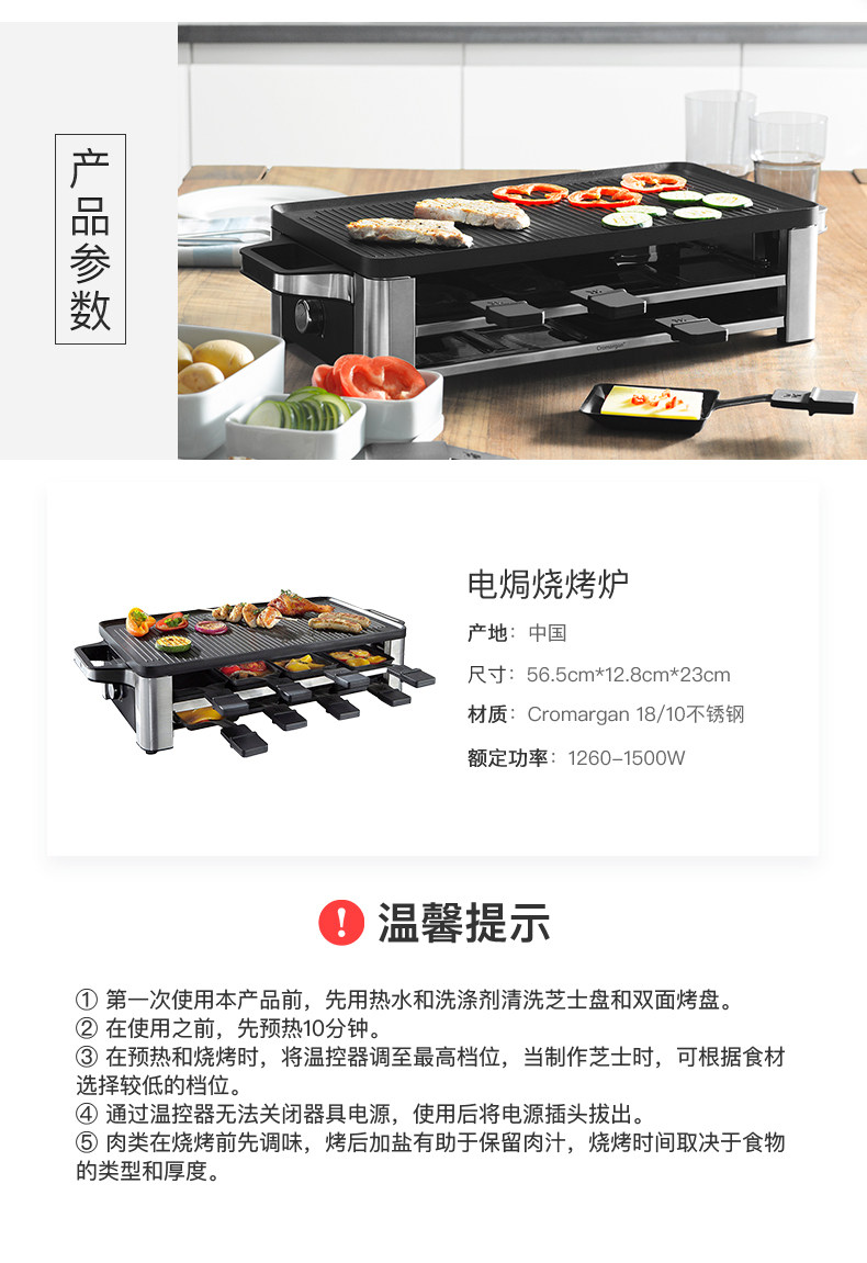 型号: 04.1504.9911 率功: 1260W~1500W 烤盘尺寸: 56.5*12.8*23cm 材质:Cromargan 18/10不锈钢 产地:中国