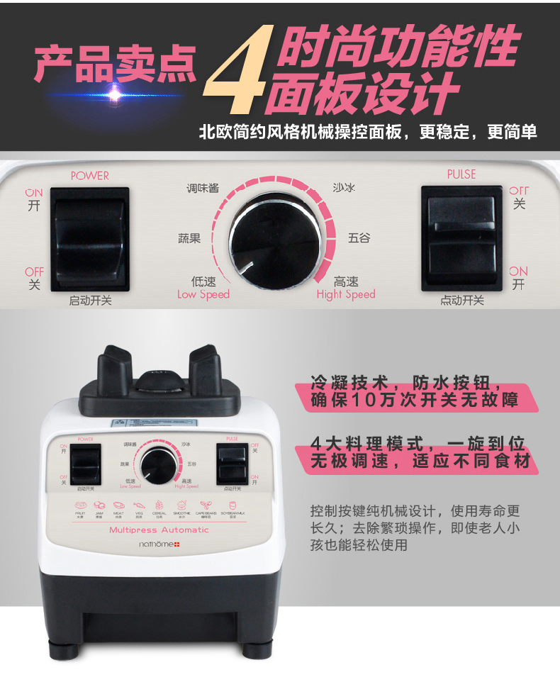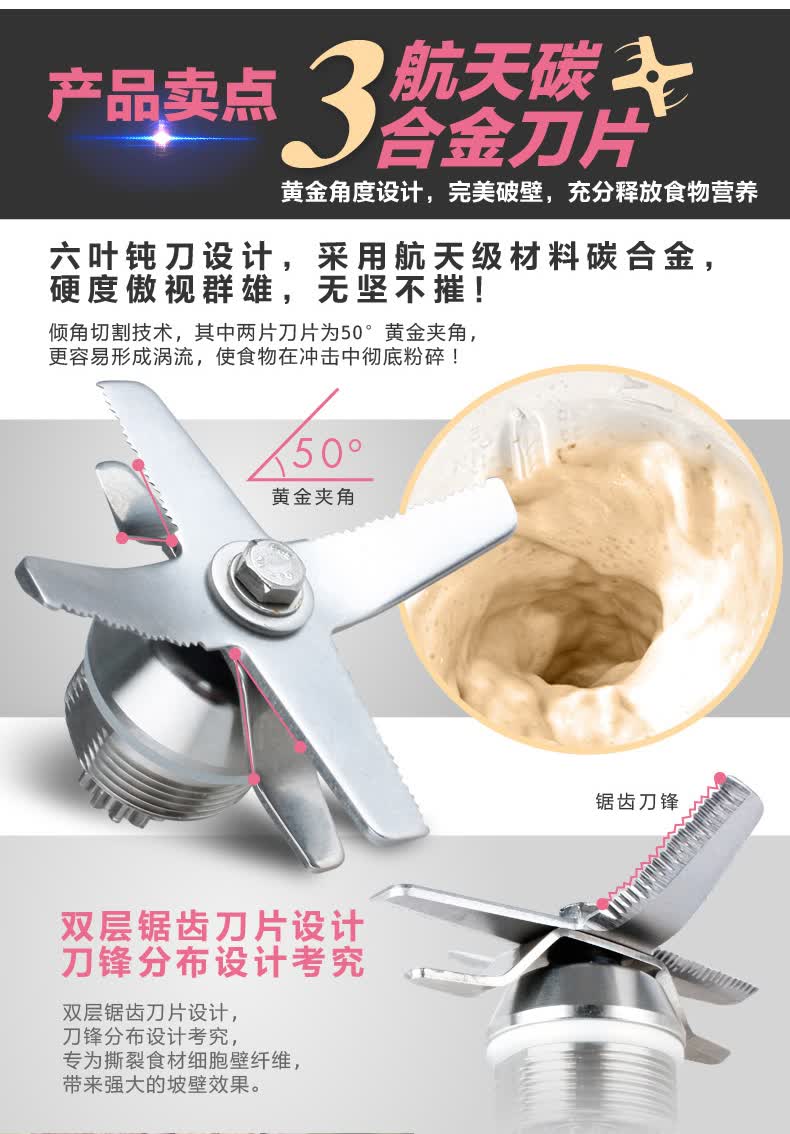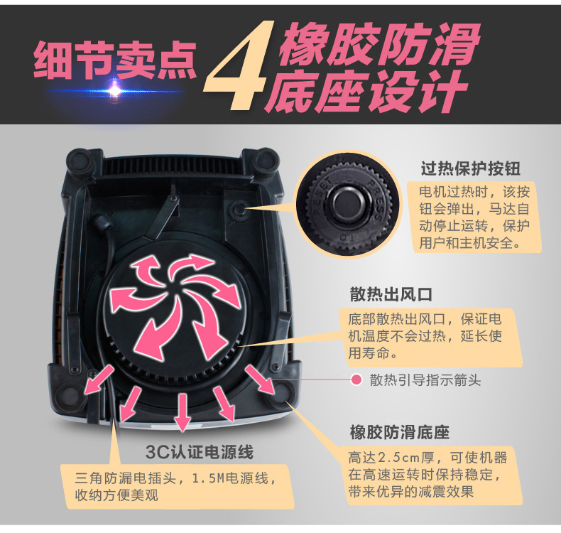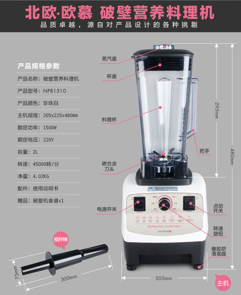 颜色:白色 额定电压/频率/功率:220V~/50Hz/1500W 容量:2L 转速:45000转/分 装箱数:1台/箱 外箱尺寸:405*240*325mm 外箱立方数:0.0300(1个立方产品数量为33个, 3个立方产品数量为100个)