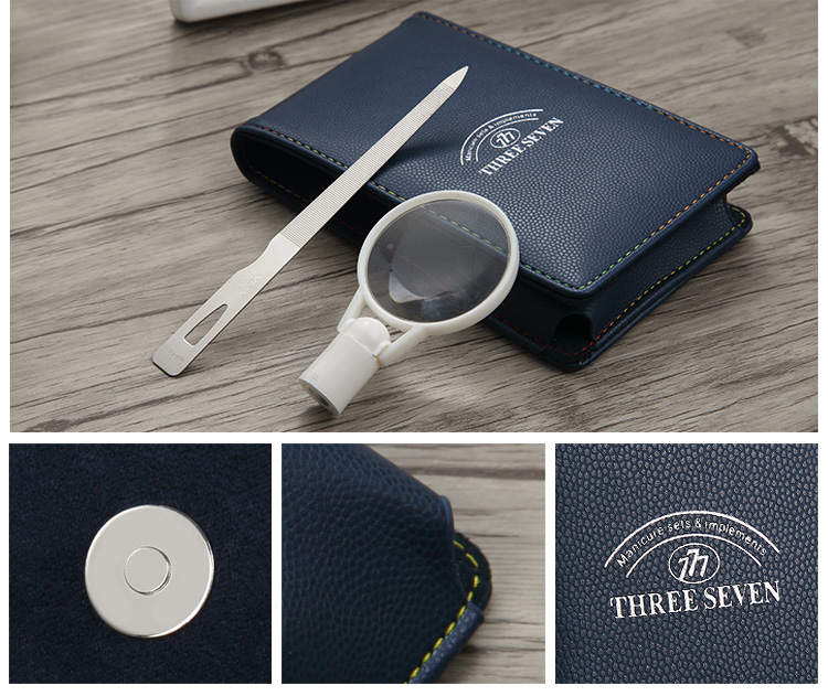 【型 号】:NTS-9011 【品 牌】:THREE SEVEN/777 【材 质】:优质碳钢+品质PU皮套 【规 格】:130*83*28mm / 124g 【套装内容】:3件套(放大镜、平口指甲刀、指甲锉)