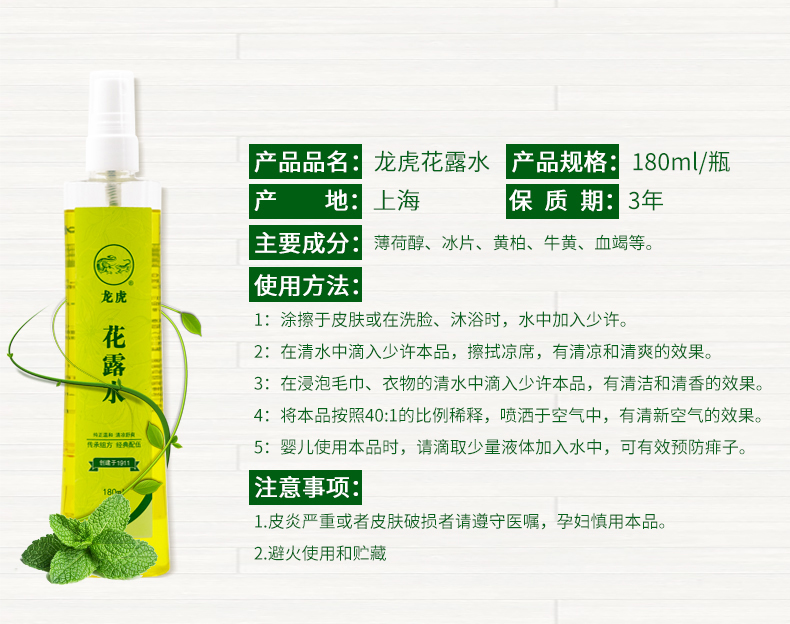 主要成分:乙醇、纯水、香精、薄荷脑、冰片、黄柏、牛黄、血竭。 主要用途:清凉止痒,温和舒爽,芳香怡神,天然植物,四季适用。
