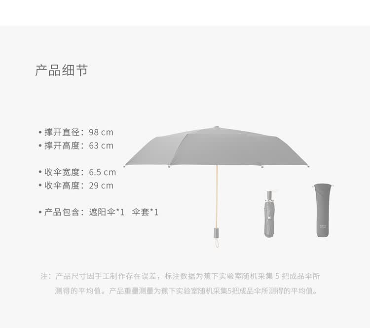商品名称:蕉下BANANAUNDER太阳伞遮阳伞黑胶防紫外线太阳伞 曜黑商品编号:10190125735店铺: BananaUnder蕉下专卖店商品毛重:0.56kg雨衣尺码:其它适用性别:通用风格:纯色颜色:黑色,红色,蓝色是否自动:手动分类:晴雨伞适用人群:成人雨伞折数:三折伞
