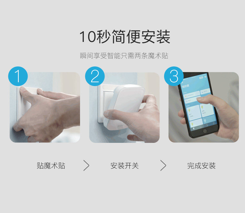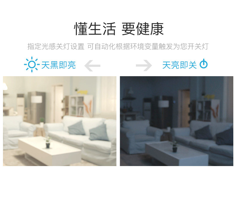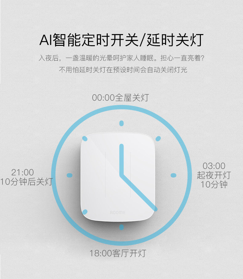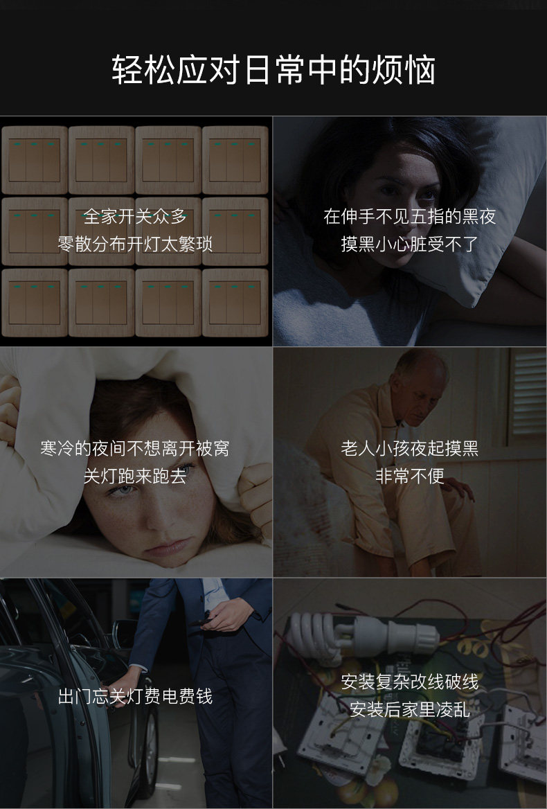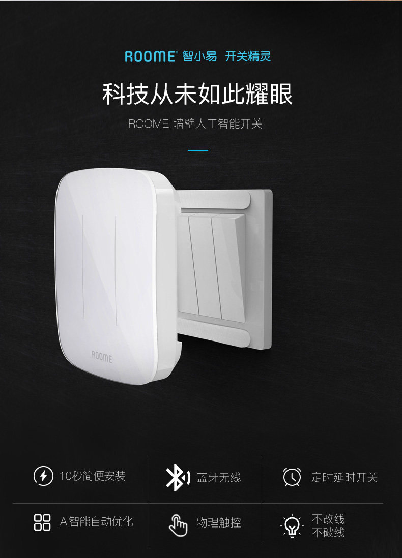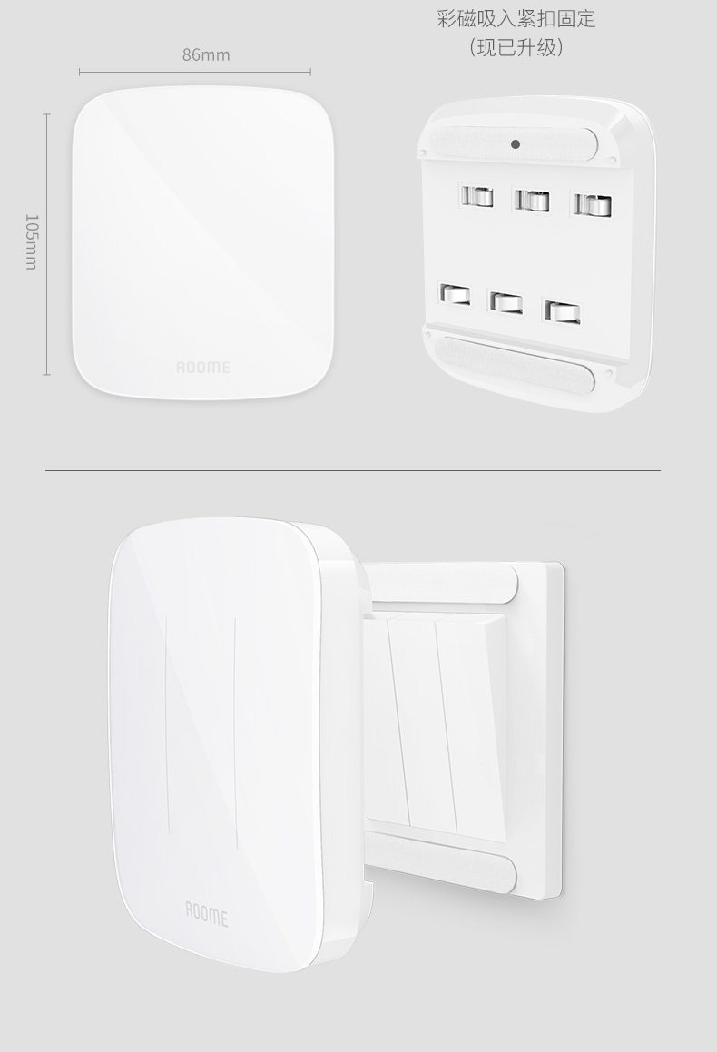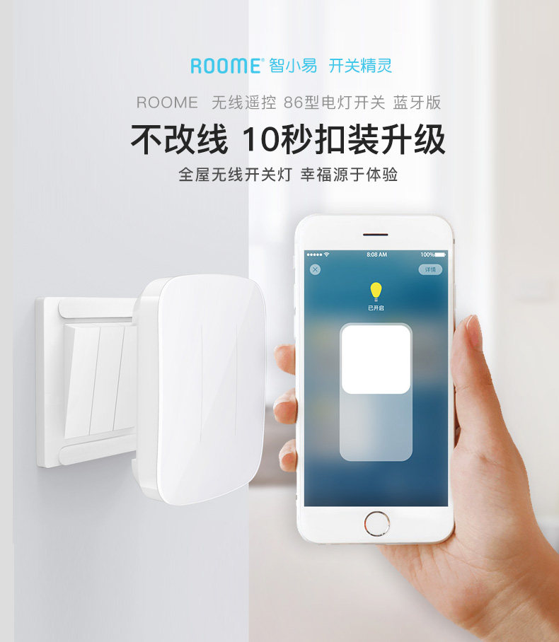 直接附加在现有翘版开关之上,通过现有墙面开关的传递控制灯具,从而将普通开关快速升级为智能开关。具有定时自动开灯/关灯,光感自动关灯的自动控制能力。