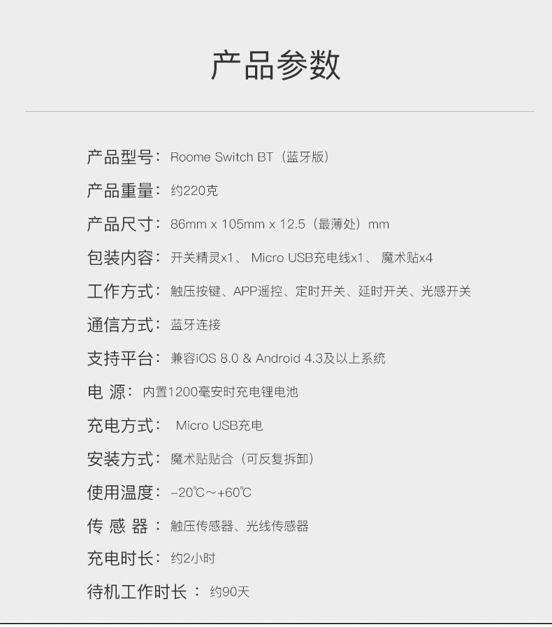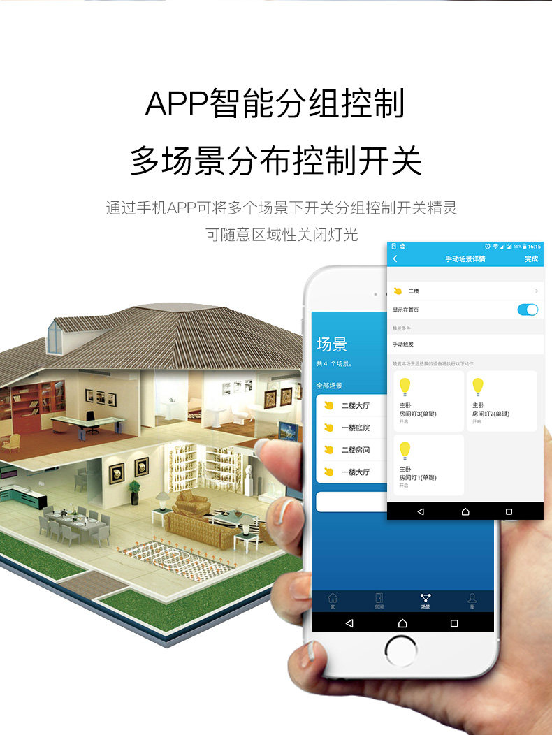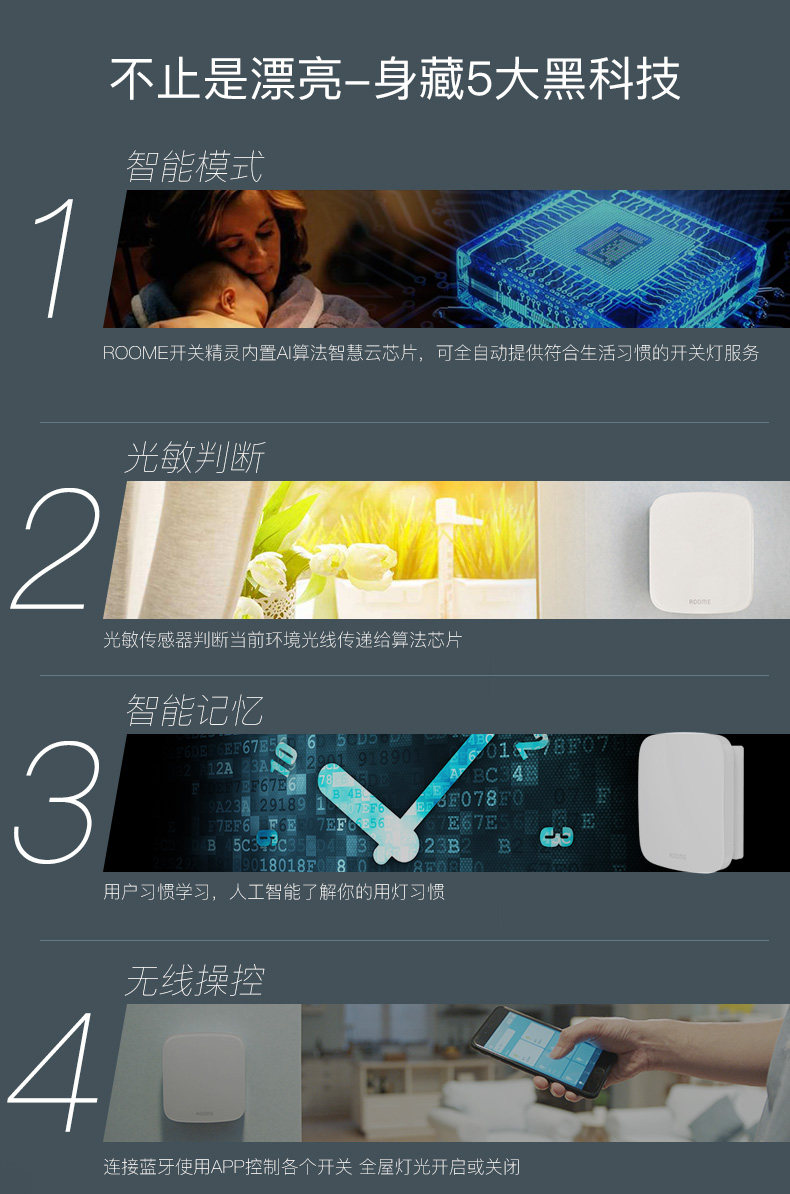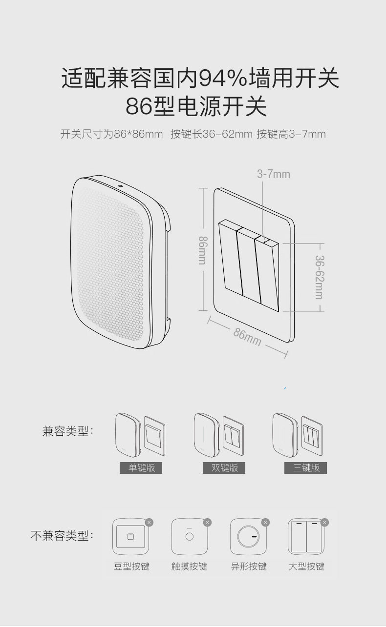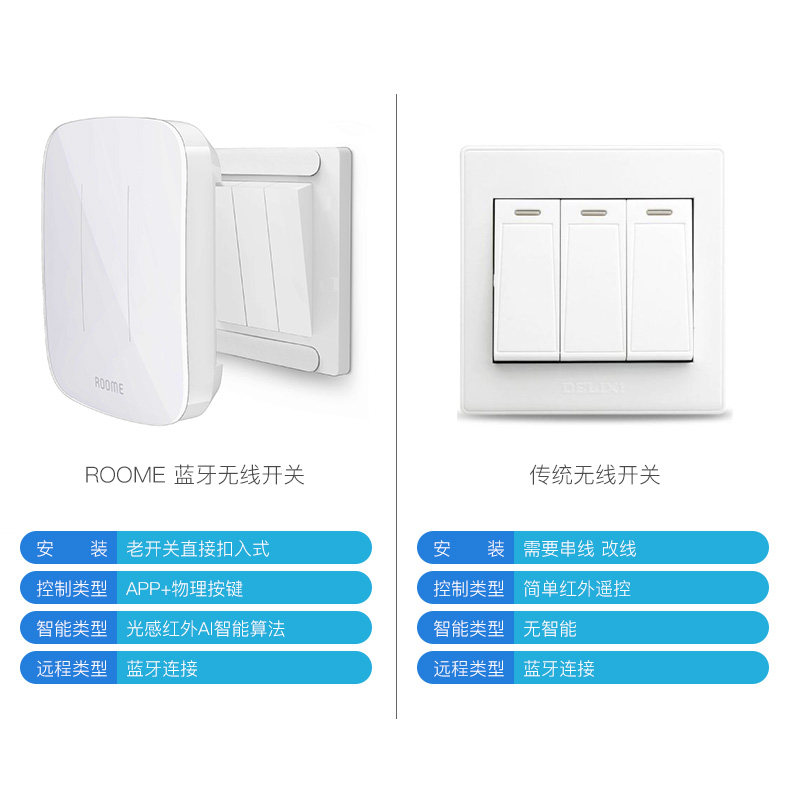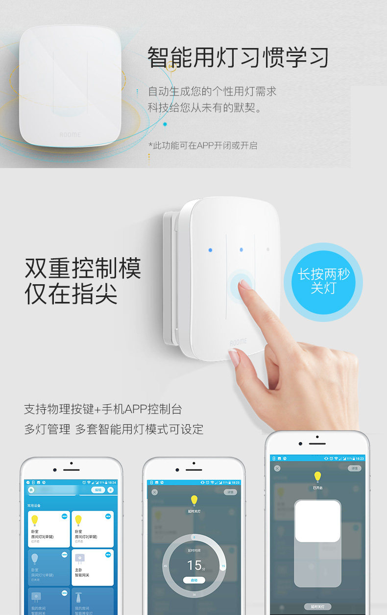 直接附加在现有翘版开关之上,通过现有墙面开关的传递控制灯具,从而将普通开关快速升级为智能开关。具有定时自动开灯/关灯,光感自动关灯的自动控制能力。