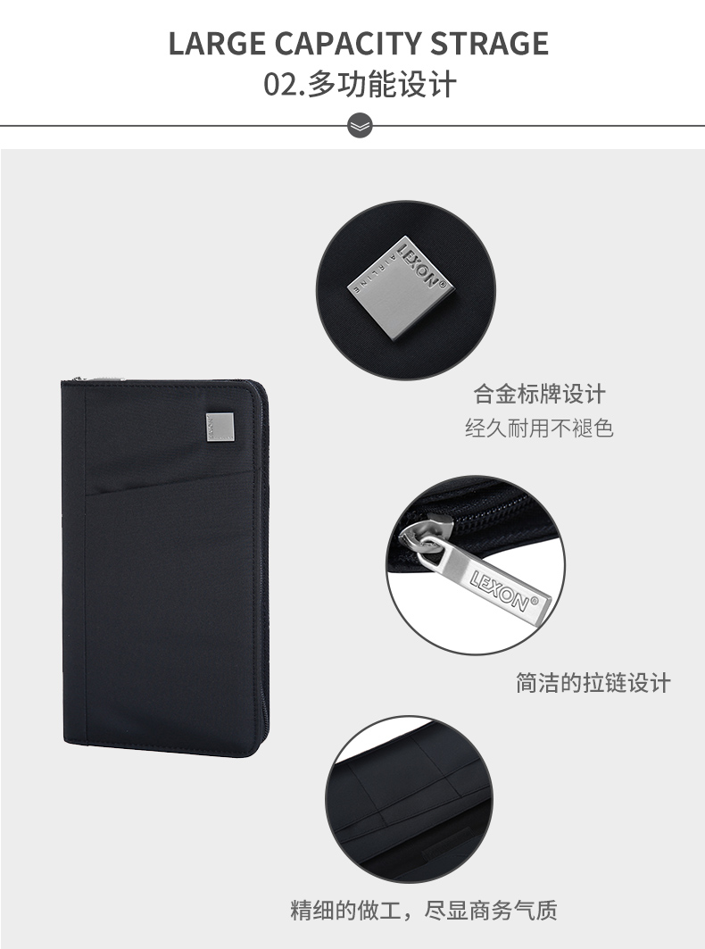 护照夹 - 拉链开合设计 - 信用卡,机票,护照夹隔层面料采用航空防水面料,防生活泼水。外表时尚,美丽又简约的多功能护照夹,笔、护照、机票、信用卡等等证件都能放在一起,贴心的拉链设计不怕东西会遗失,让您出外旅行更方便。内置写字笔,方便使用记录。