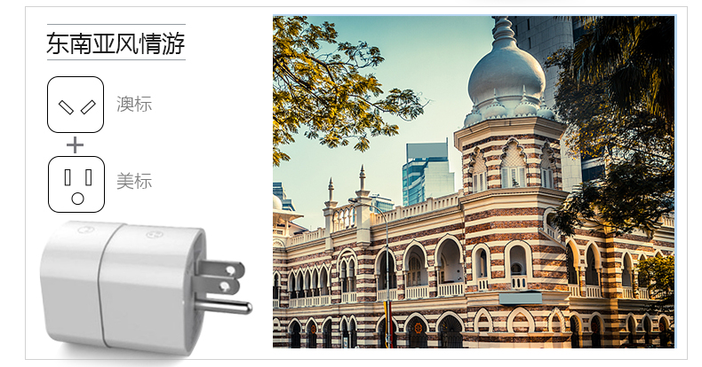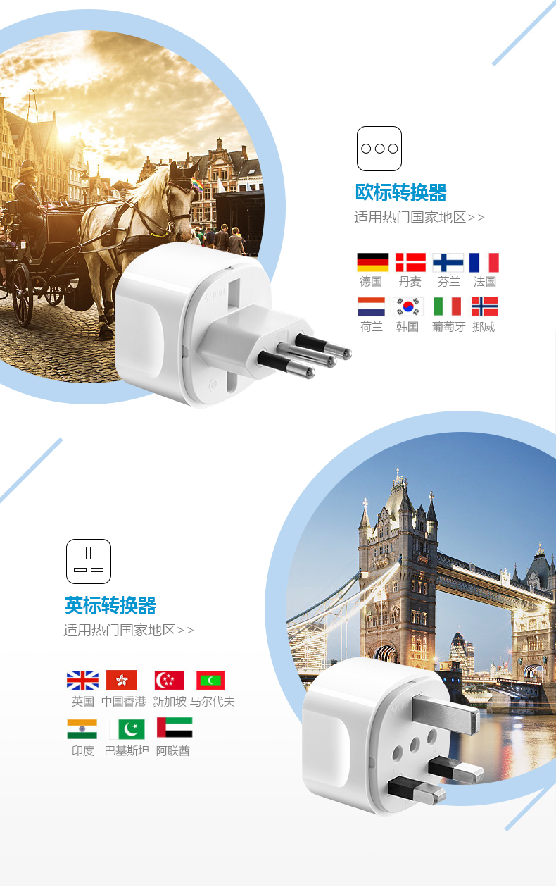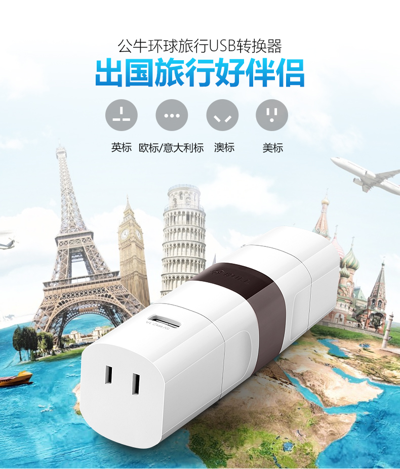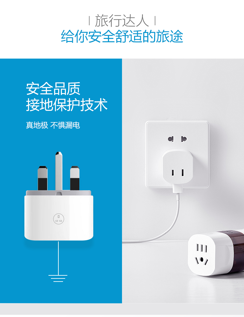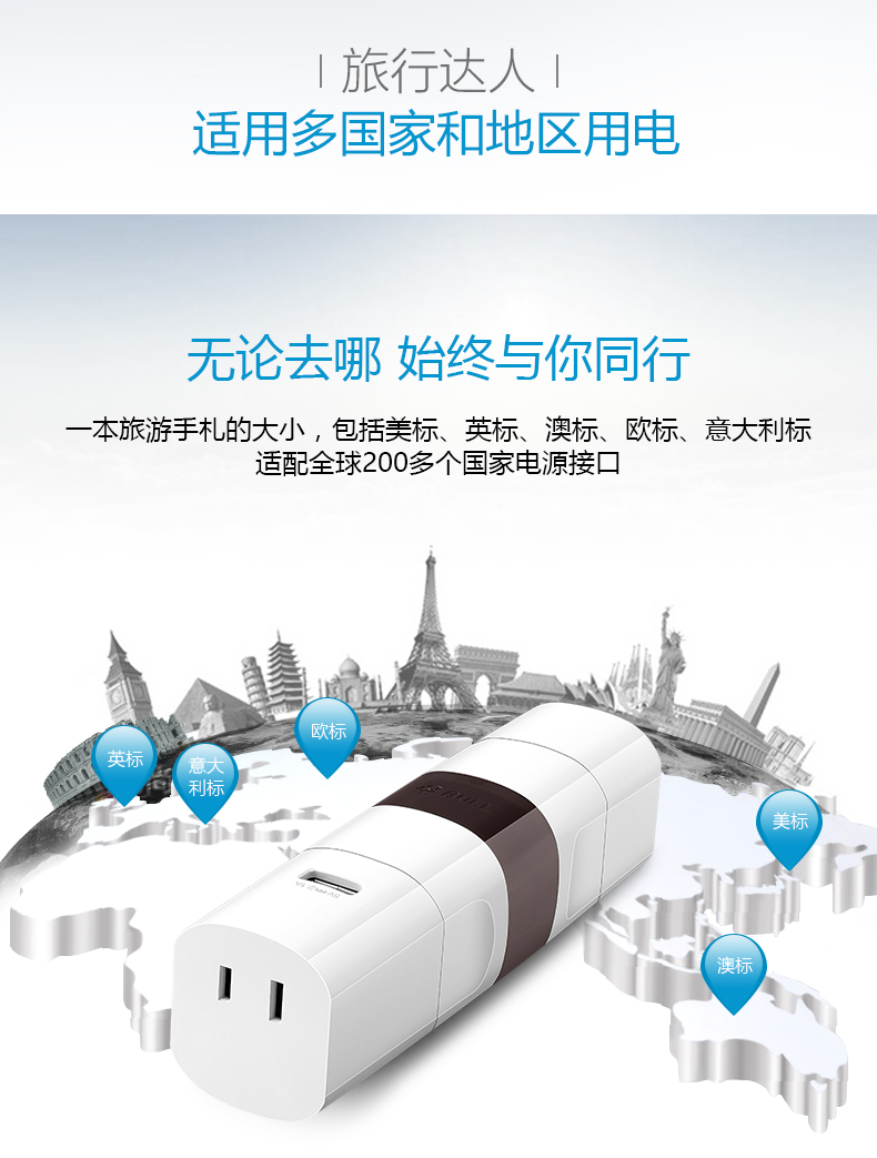 英标、欧标/意大利标、澳标、美标 方便携带,可单独或组合使用 每一个转换插口均配有地极,在支持的国家都能将电器安全的接地 安全保护门,360°无触电 随身收纳,配有可携带收纳袋