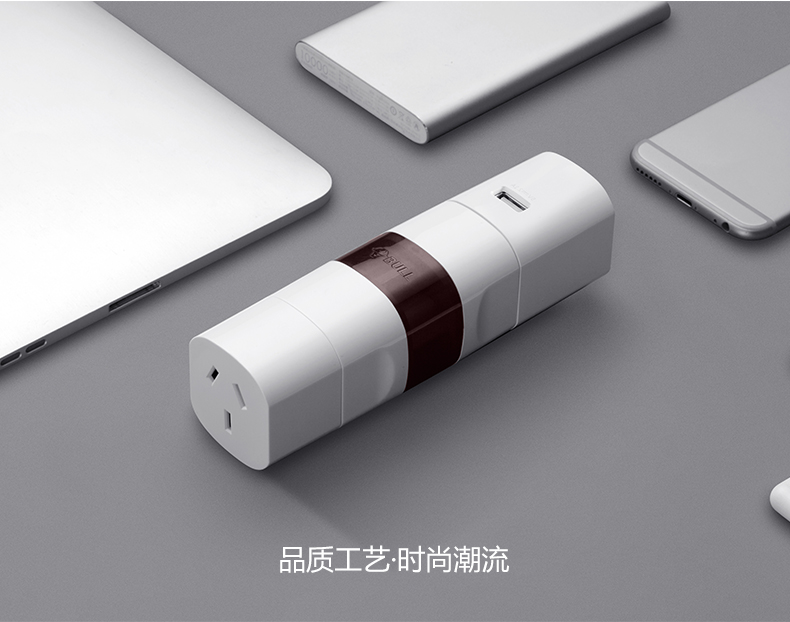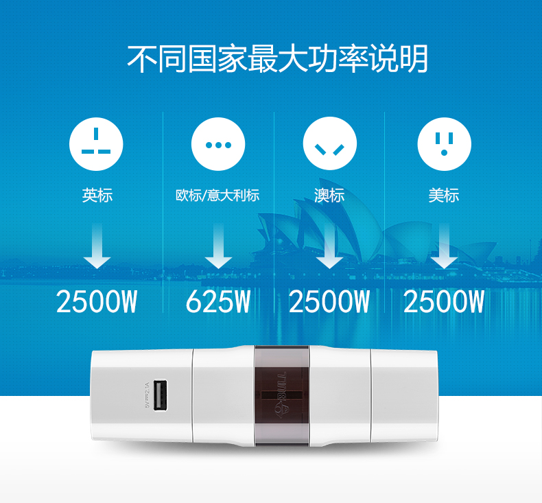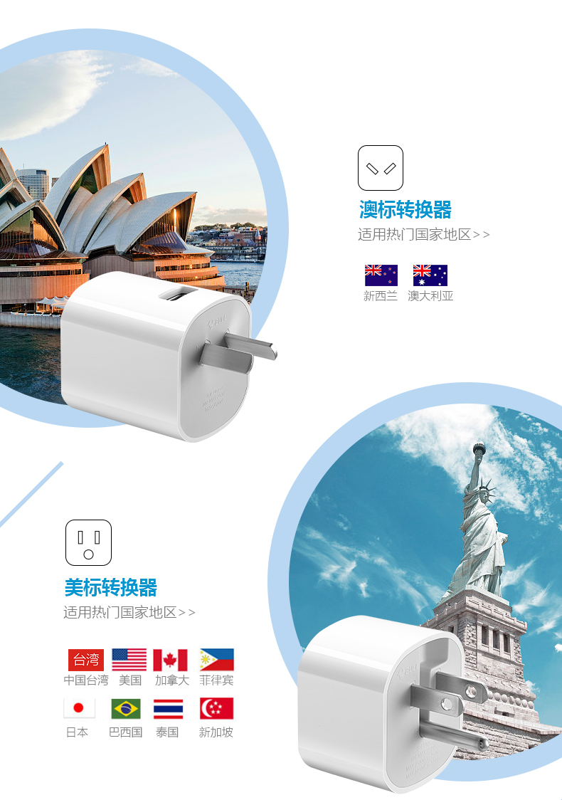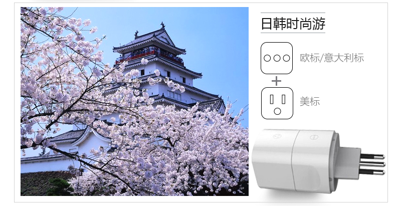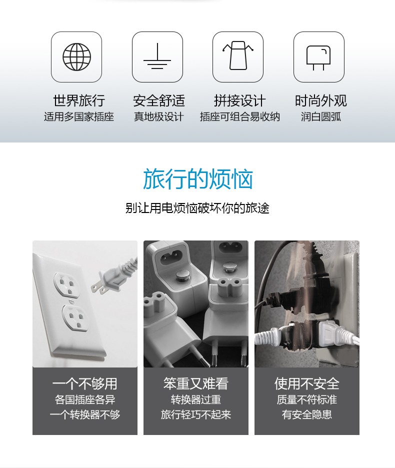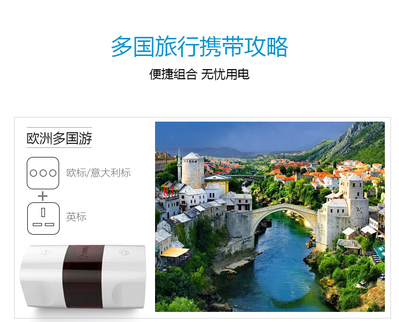 英标、欧标/意大利标、澳标、美标 方便携带,可单独或组合使用 每一个转换插口均配有地极,在支持的国家都能将电器安全的接地 安全保护门,360°无触电 随身收纳,配有可携带收纳袋