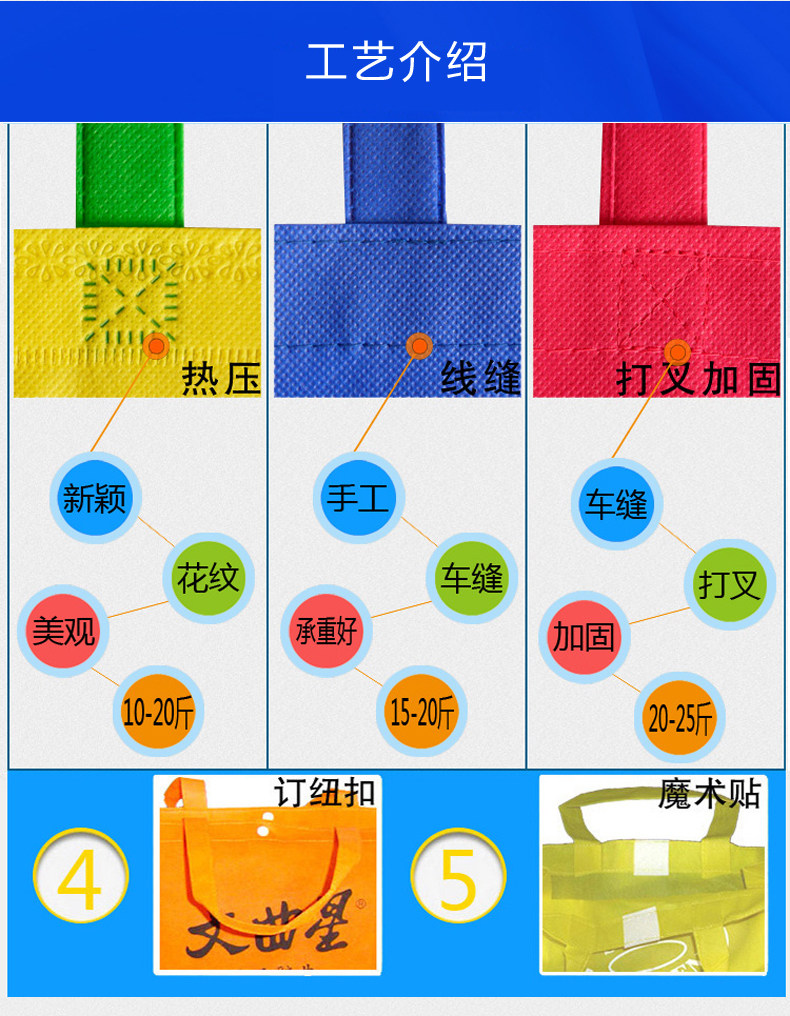 材料厚度: 无纺布. 尺 寸: 38高*30宽*8侧边CM,手提45*2.5CM. 做 工: 手工车缝,袋口手提机器压花. 印 刷: 单色双面丝印. 起 订量: 1000只起订. 生产时间: 7天之内出货. 包装方式: 防水编织袋包装,一件1000只.