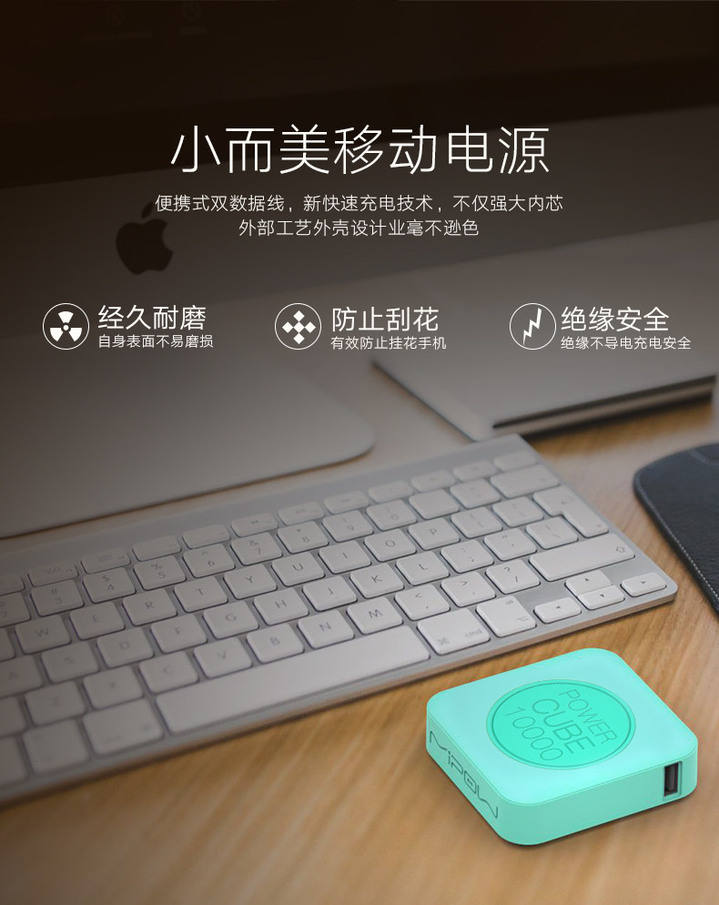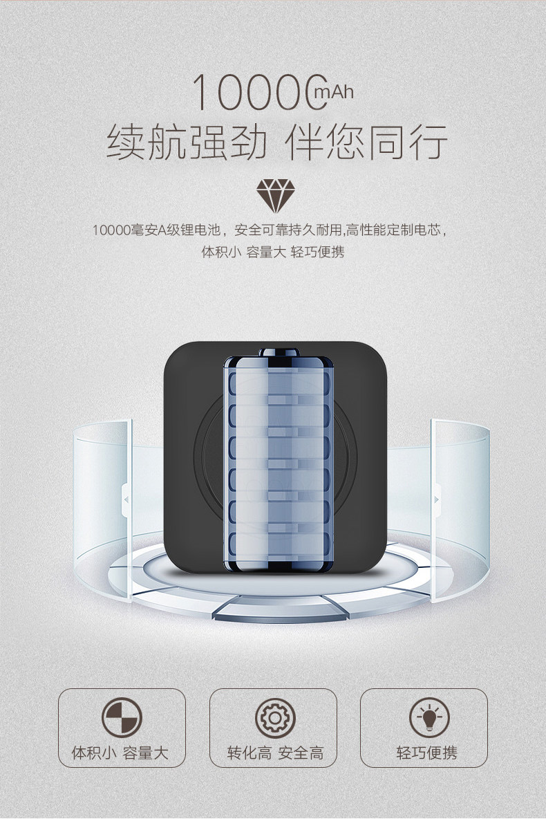 产品规格:10000毫安, 重量:187g 型号: SP10000 尺寸:76*23*76mm