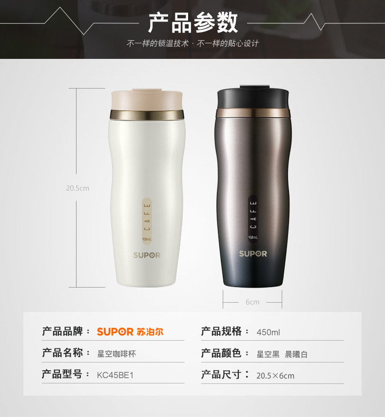 包装尺寸:182*182*224mm 装箱尺寸:574*384*239mm 装箱数量:24个 整箱毛重:11.712Kg 净 重:8.496kg 容 量:450ML 单品毛重:0.488kg 净 重:0.354kg 材 质:304不锈钢 颜 色:星空/晨曦 保温性能:24小时保温35度以上