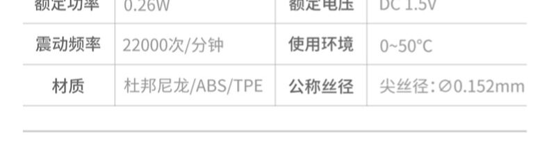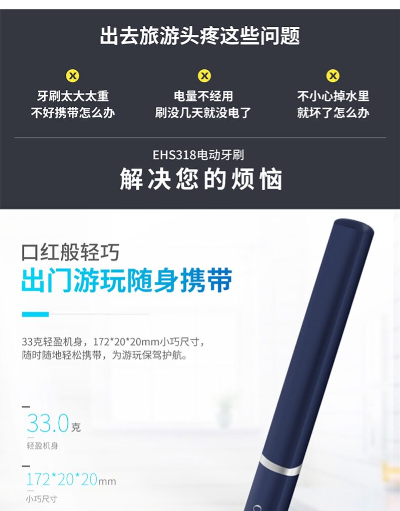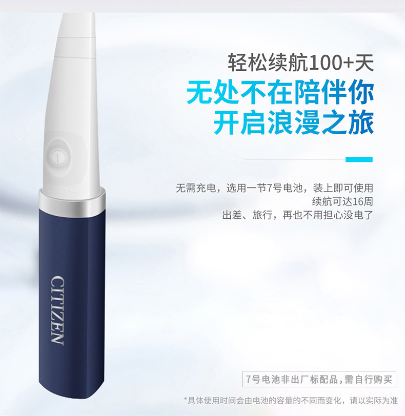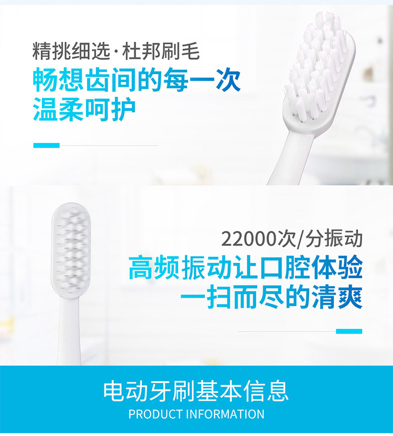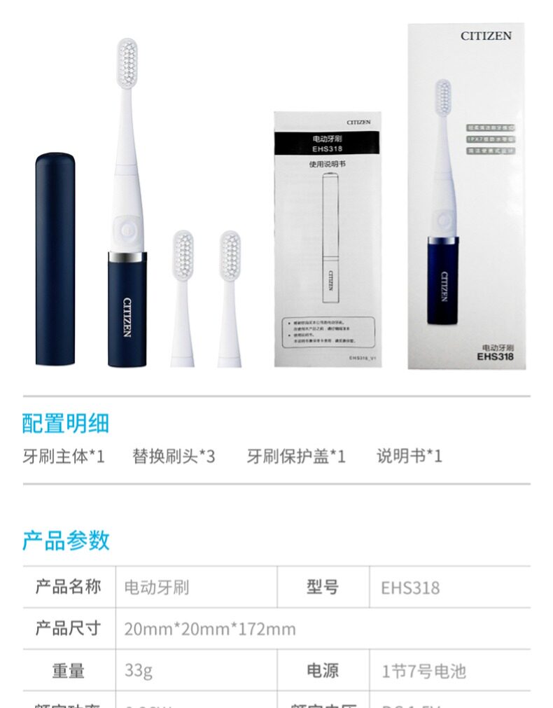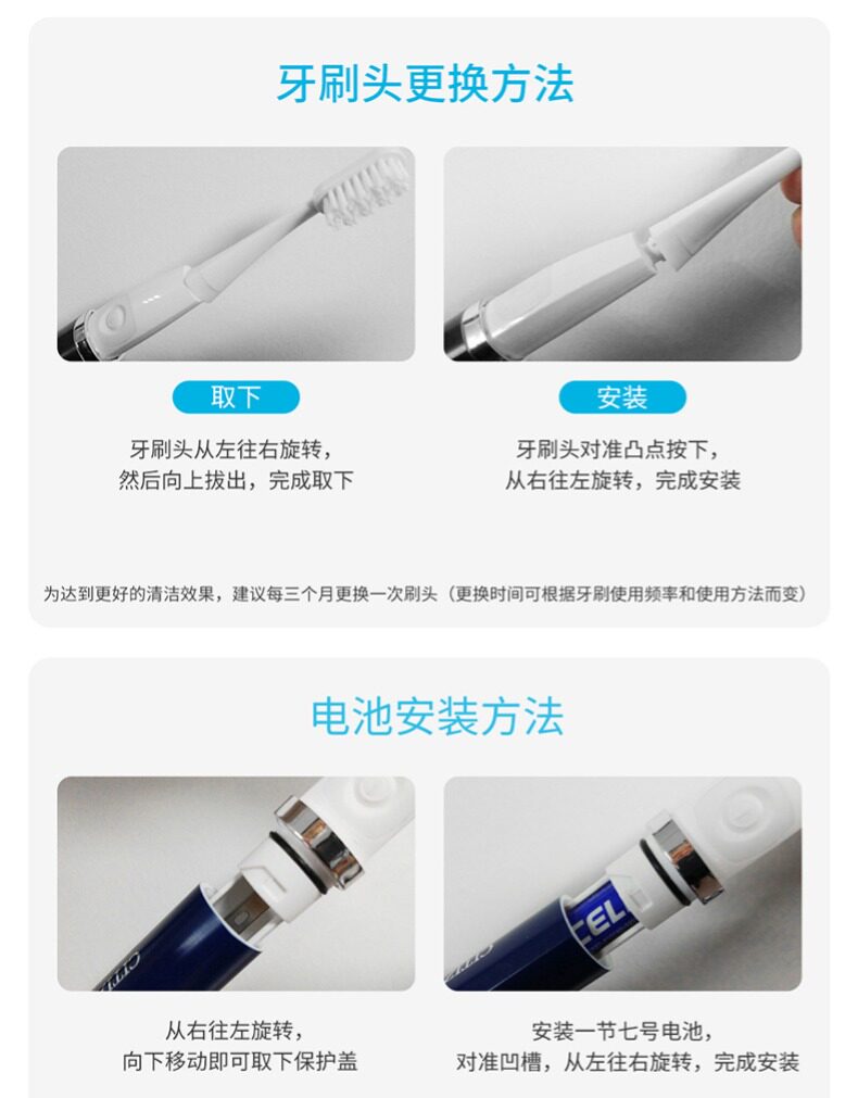 ·两种模式:清洁模式、轻柔模式 ·圆三角菱形外观,小巧便携,随身携带 超长续航,一节7#电池可以使用120天(一天两次,每次两分钟) ·牙刷防水等级:IPX7级,有效保护产品,延长使用寿命 ·刷头可更换,标配有3个刷头