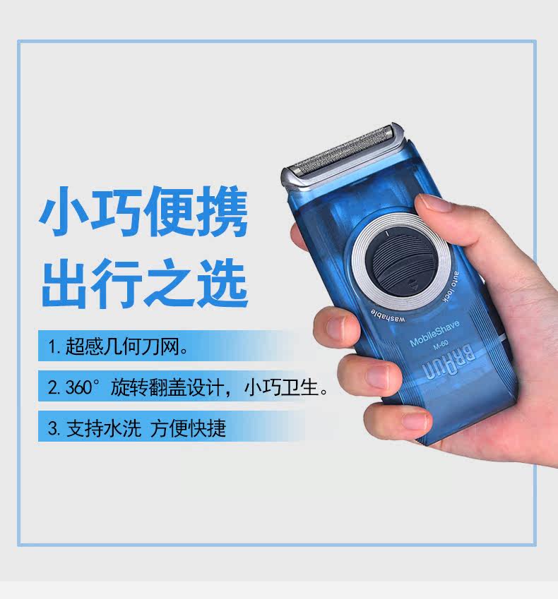 专利超感几何刀网、往复式单刀头 特宽浮动网膜 360度旋转滑盖设计 全身水洗 嵌入式清洁小刷 电源开关安全锁 小巧轻便随身携带