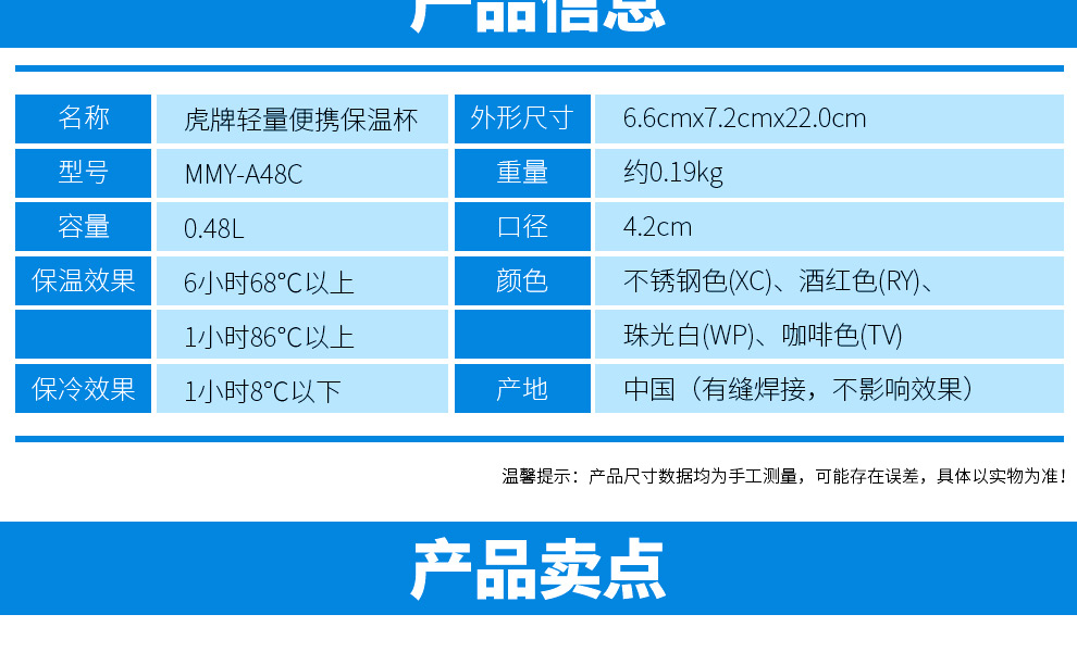 虎牌 tiger 不锈钢真空杯 轻量保温杯保冷杯 便携式水杯 杯子 MMY-A48C 480ml