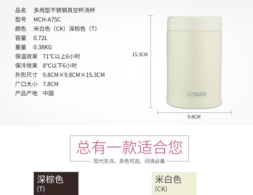 TIGER/虎牌保温杯多功能真空杯不锈钢保温汤杯 MCH-A75C 深棕色T