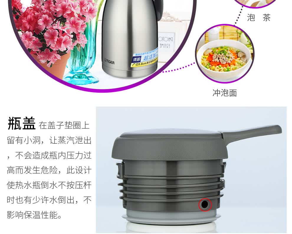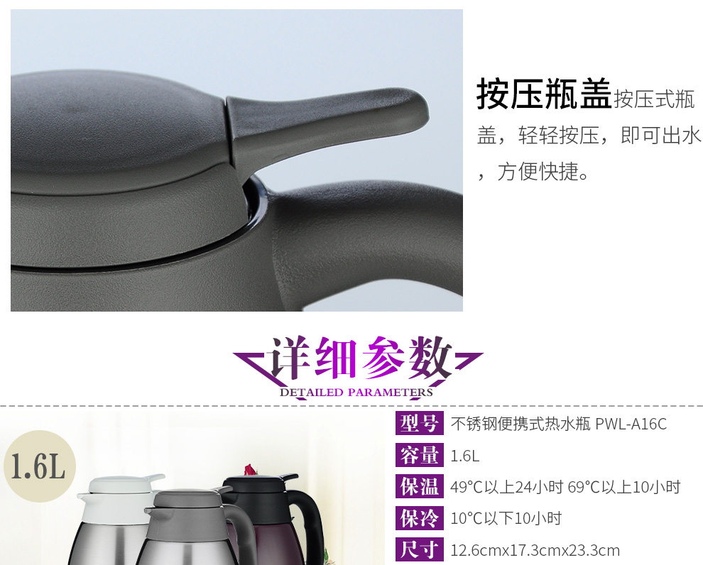 虎牌(Tiger)保温壶不锈钢便携按压式热水瓶PWL-A16C 1.6L 天鹅灰TG