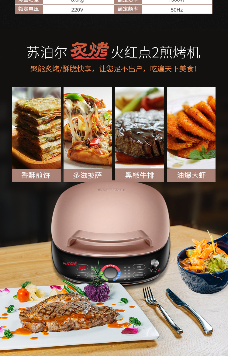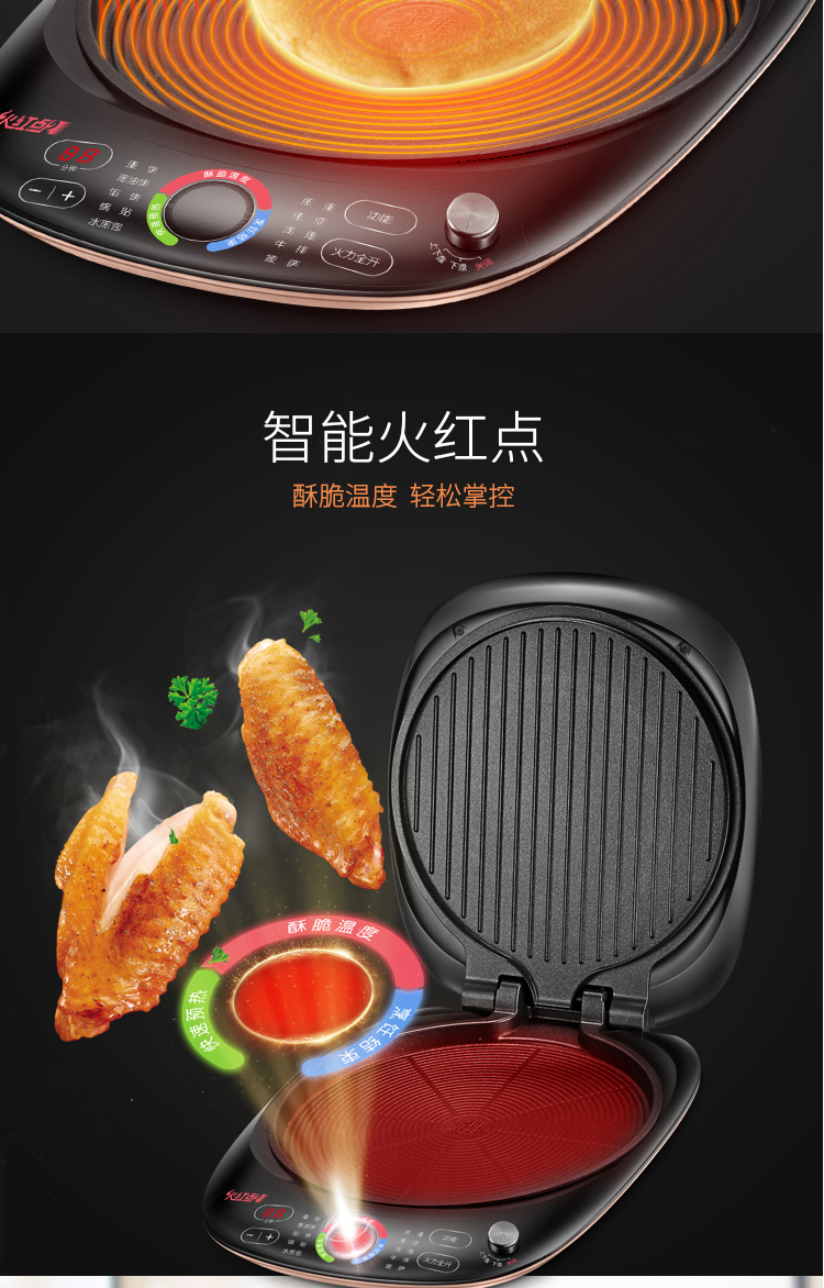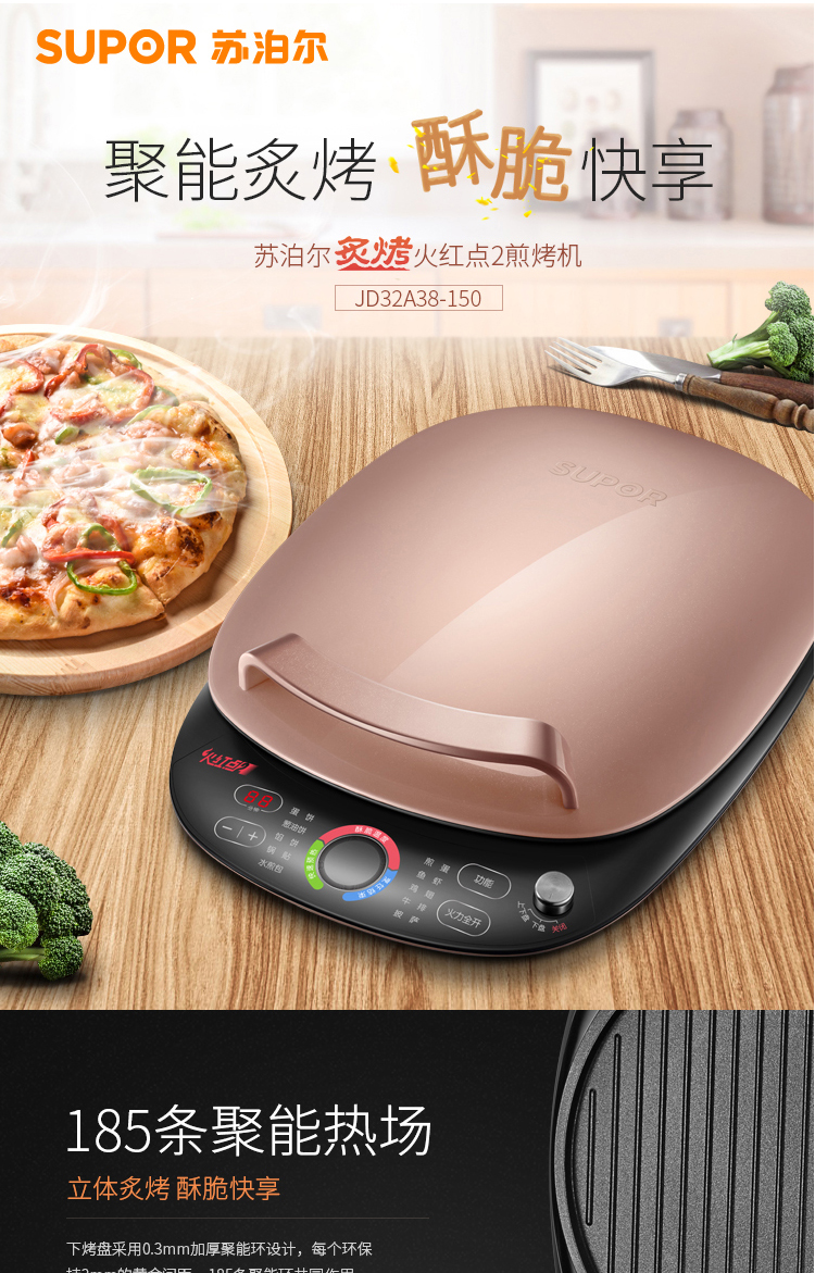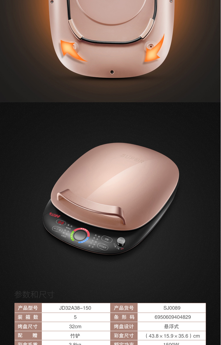 型号:JD32A38-150 额定电压:220V 额定功率:1500W 彩盒尺寸:438*159*356MM 包装数量:5PCS 产品重量:3.8KG 功能描述: 1.火红点2时刻掌握酥脆温度; 2.32cm聚能炙烤纹理烤盘,1500W大火力; 3.触控设计,更时尚; 4.电源线收纳设计。