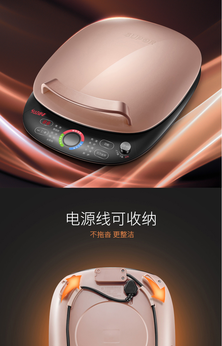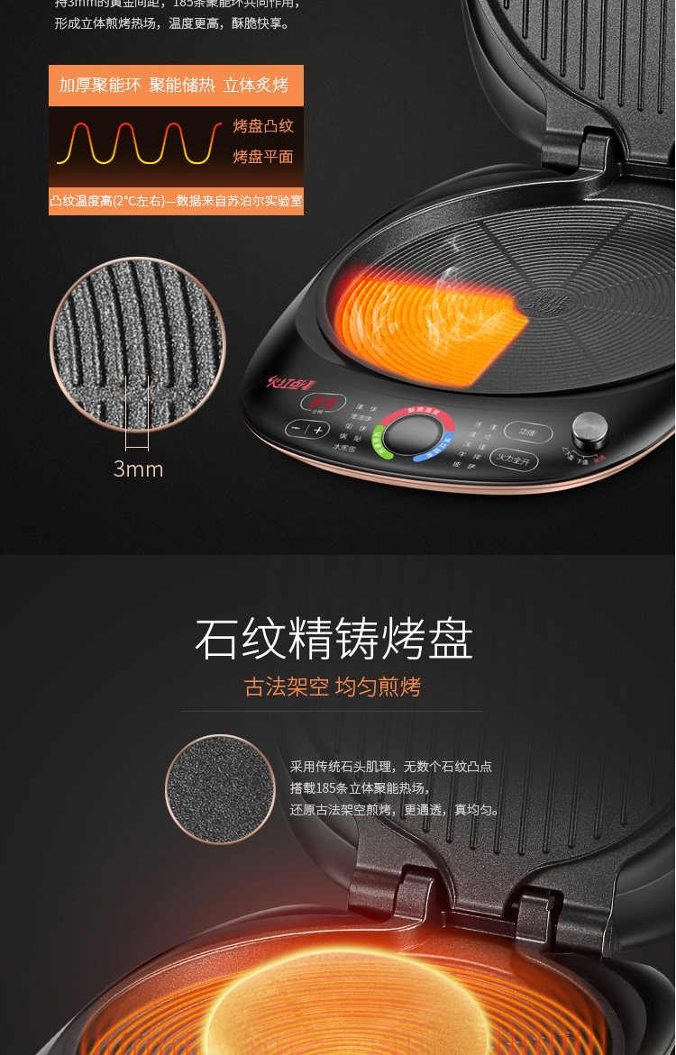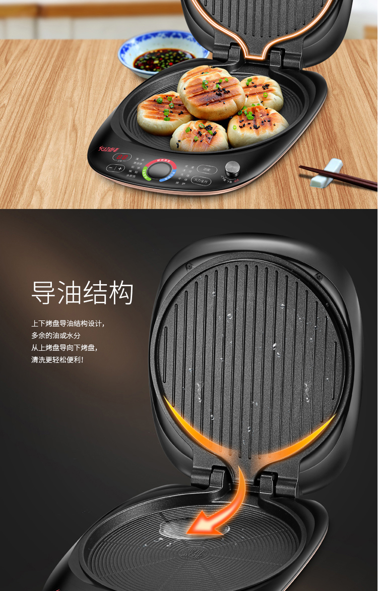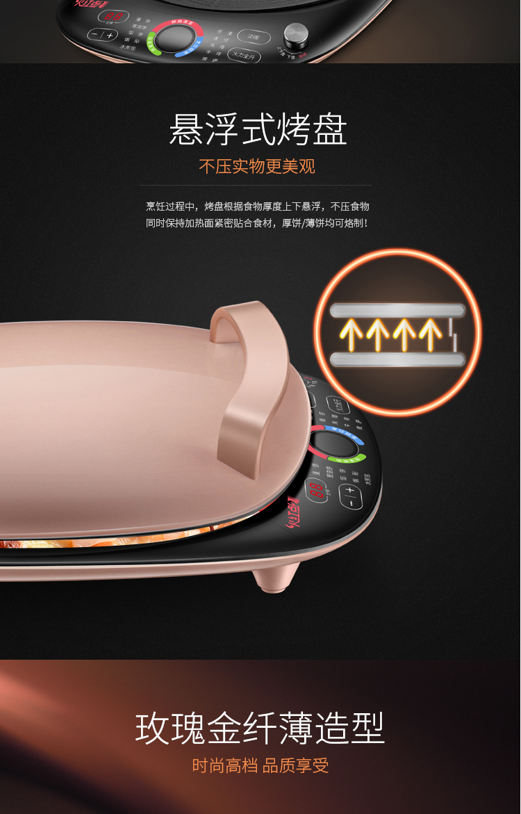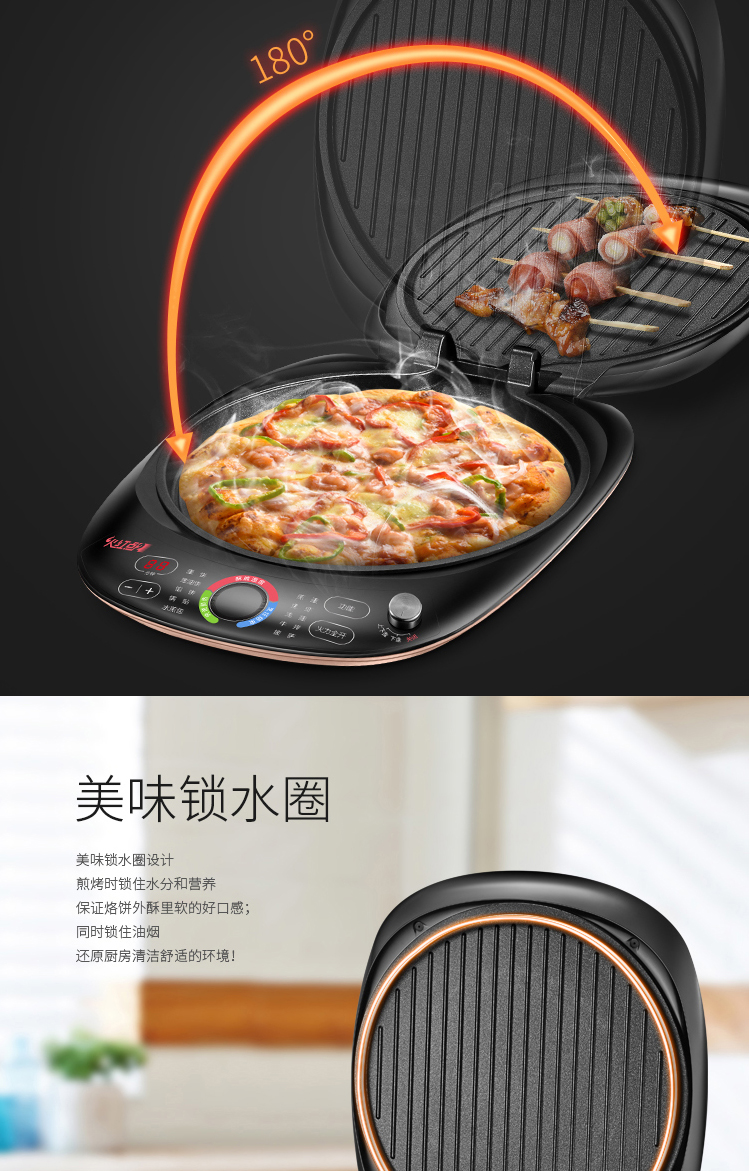 型号:JD32A38-150 额定电压:220V 额定功率:1500W 彩盒尺寸:438*159*356MM 包装数量:5PCS 产品重量:3.8KG 功能描述: 1.火红点2时刻掌握酥脆温度; 2.32cm聚能炙烤纹理烤盘,1500W大火力; 3.触控设计,更时尚; 4.电源线收纳设计。