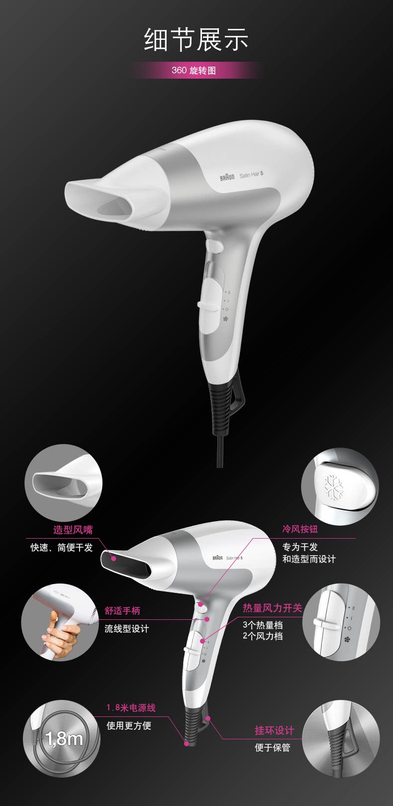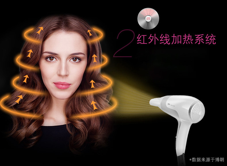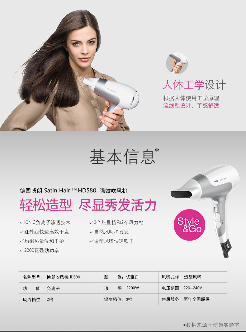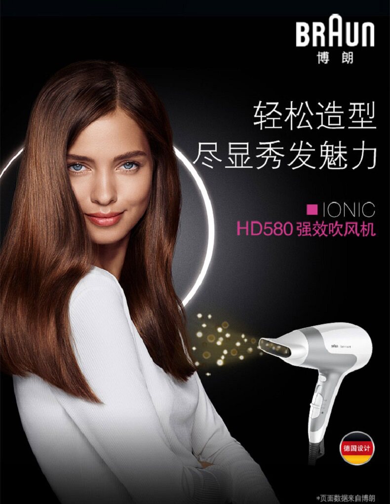 产品名称:Braun/博朗 HD580 产地: 中国大陆 便携性能: 手柄不可折叠智能类型: 不支持智能电吹风品牌: Braun/博朗 型号: HD580电吹风 最大功率: 2000W以上电吹风档位: 5档以上电吹风风嘴样式: 单集风嘴颜色分类: 白色功能: 负离子 冷热风 售后服务: 全国联保