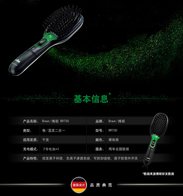 品牌:Braun/博朗 型号:3558 产地: 中国大陆 电源方式: 电池 颜色分类: 黑绿色 功率: 25W以下 类型: 多功能美发器导热体 直径: 15mm及以下 导热体材质: 其他/other 最佳造型时间: 3分钟(含)-5分钟(含) 适用发质: 干湿两用段数: 其他/other