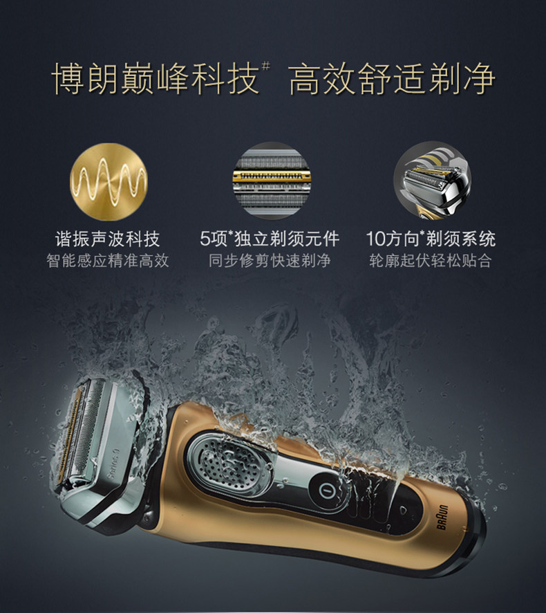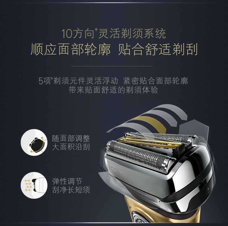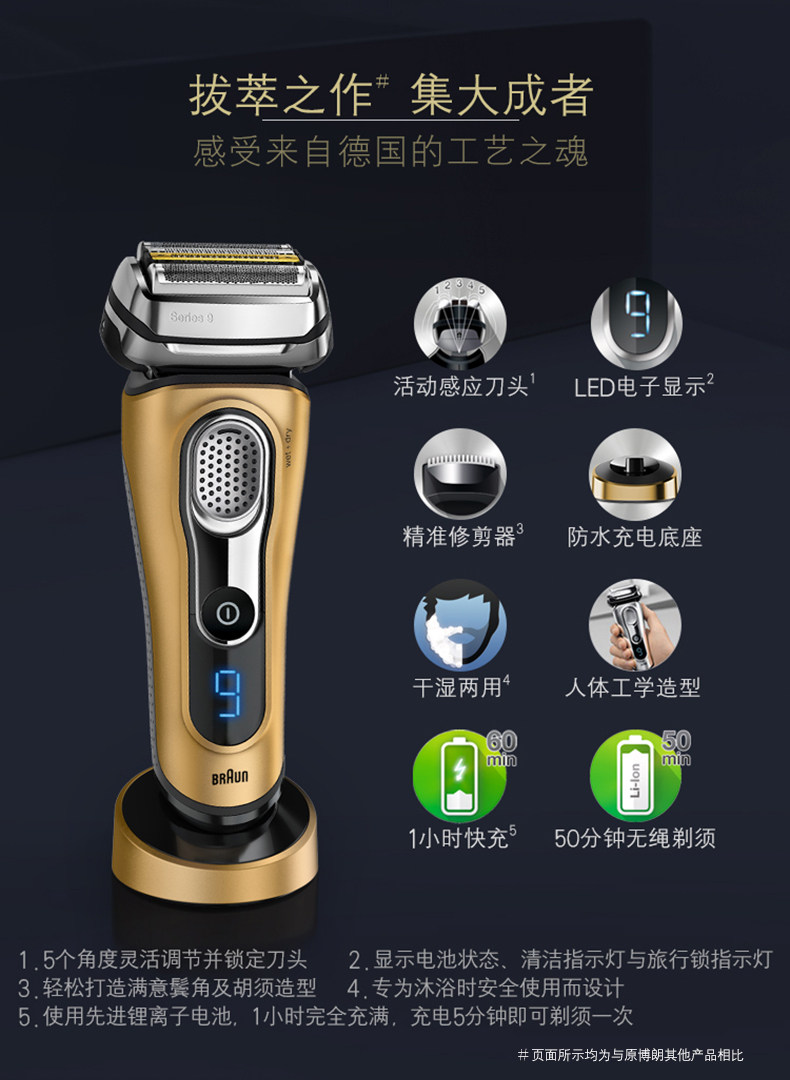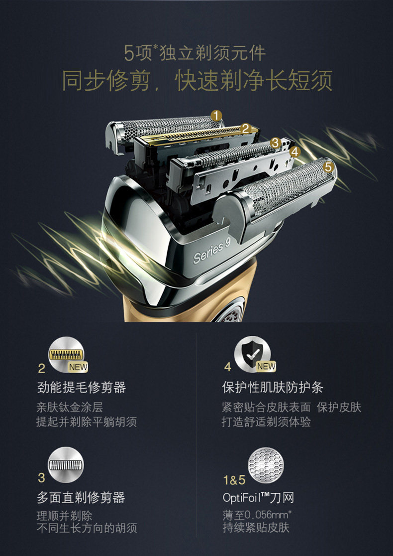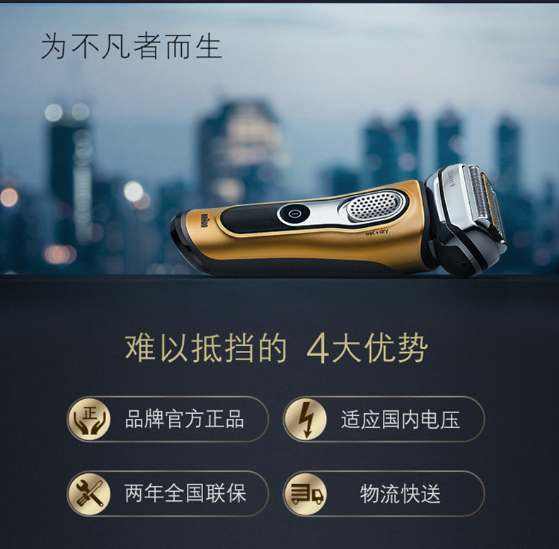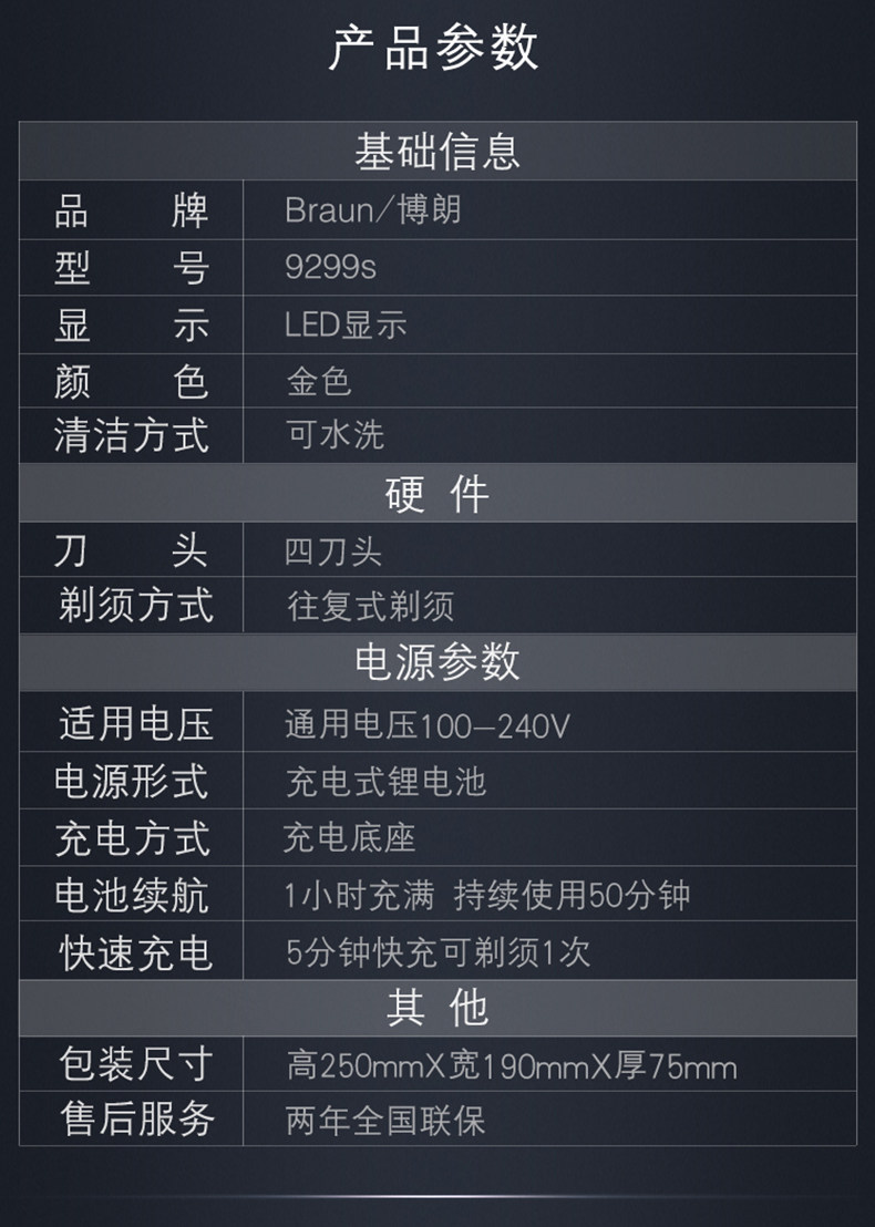 产品名称:Braun/博朗 9299s 颜色分类: 金色 修发器/修剪器: 有 充电时间: 1小时 刀头: 往复式4刀头 品牌: Braun/博朗博朗型号: 9299S完全充电使用时间: 50分钟 清洁方式: 全身水洗 电源方式: 电源式 适用电压: 全球通用 电压(100-240V) 售后服务: 全国联保