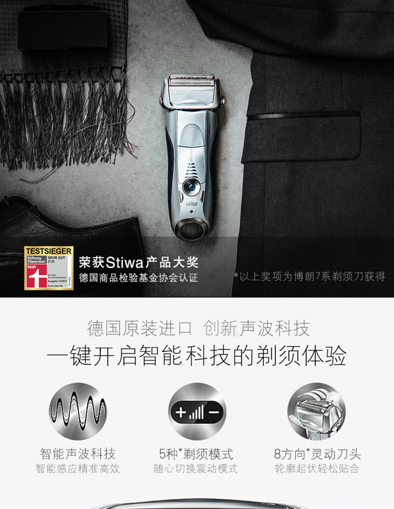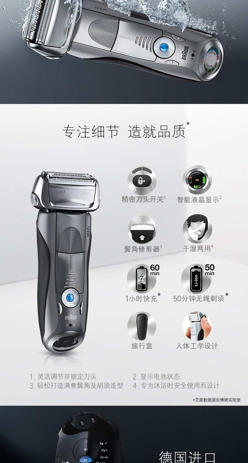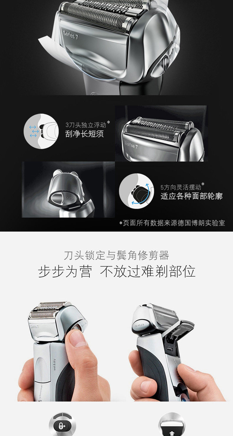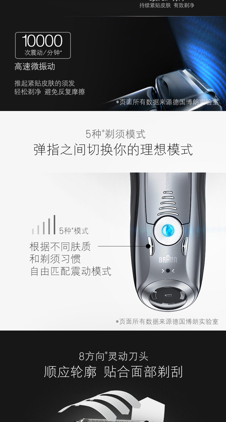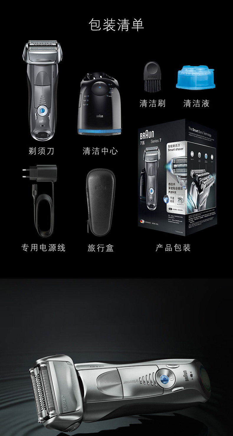 产品名称:Braun/博朗 7865cc 颜色分类: 黑色 修发器/修剪器: 有 充电时间: 1小时 刀头: 往复式3刀头 品牌: Braun/博朗 博朗型号: 7865cc 完全充电使用时间: 50分钟 清洁方式: 专用清洁座清洗 电源方式: 充电/电源两用式 适用电压: 全球通用电压(100-240V) 售后服务: 全国联保