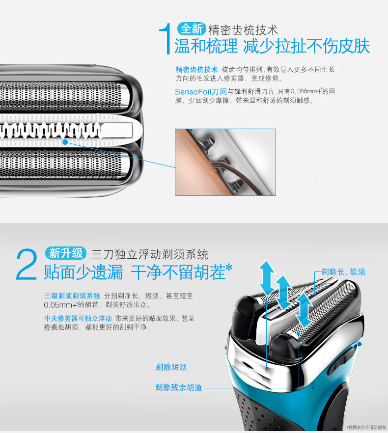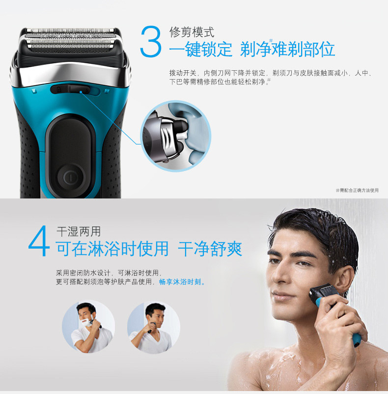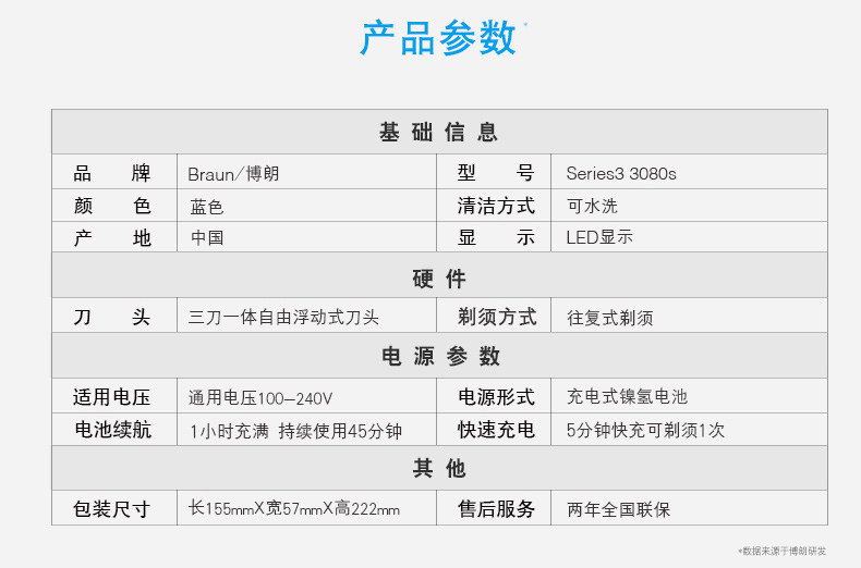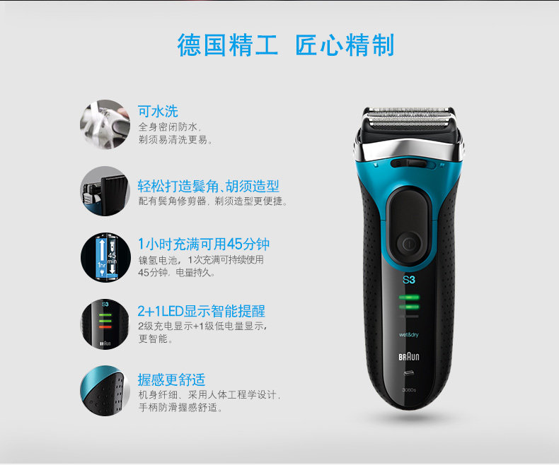 品牌:Braun/博朗 型号:5416 颜色分类: 黑色 修发器/修剪器: 有 充电时间: 1小时 刀头: 往复式3刀头 完全充电使用时间: 45分钟 清洁方式: 全身水洗 电源方式: 充电/电源两用式 适用电压: 全球通用电压(100-240V)售后服务: 全国联保