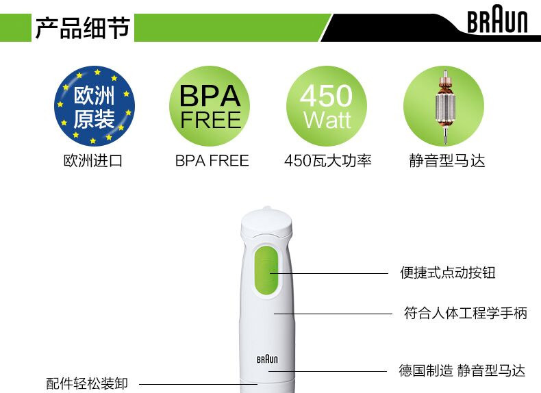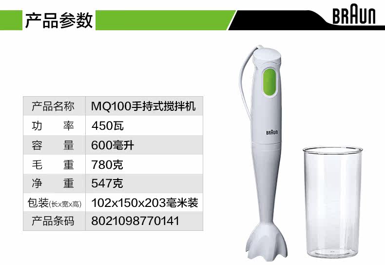 产地:波兰 功率:450 W 颜色:白 搅拌棒材质:塑料 搅拌刀材质:不锈钢 搅拌杯容量:600ml 洗碗机清洗(除马达外)