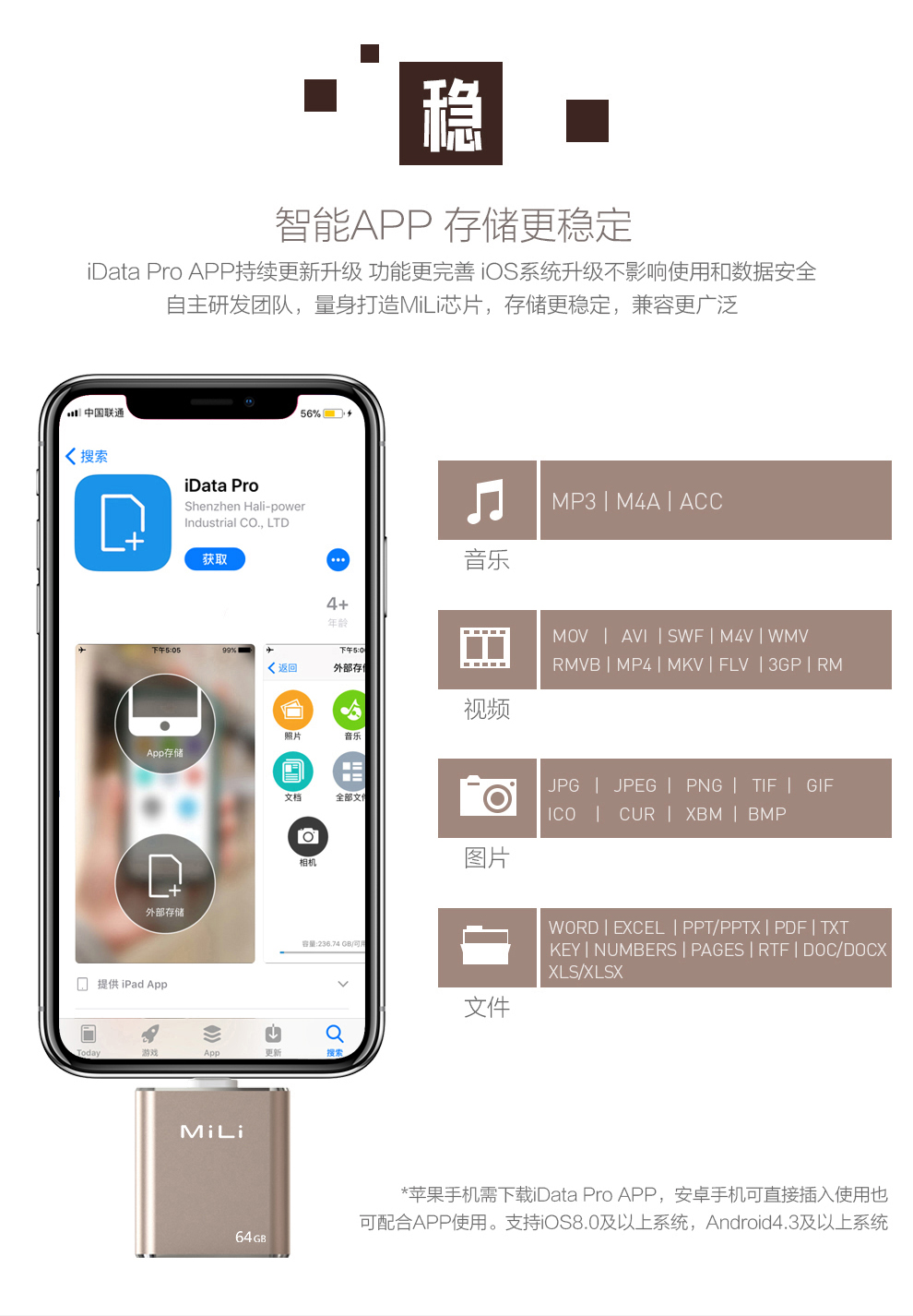 1、一键导入,瞬间扩容 解决手机内存不足 一键导入照片视频 随时随地流畅播放高清视频 2、双重加密,更安全支持iTouch ID解锁手机与PC双重加密 数字密码与iTouch ID双重保护 3、轻松解压/压缩文件支持文件压缩和解压直接编辑txt文件省时省力办公更便捷