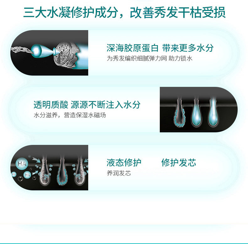 产品规格:400ml 产品功效:液态智慧修护因子,修护发芯,打通秀发水通道,保护水分不流失,为秀发提供源源水润。 适合人群:干枯毛躁发质及中性、油性头皮适用。