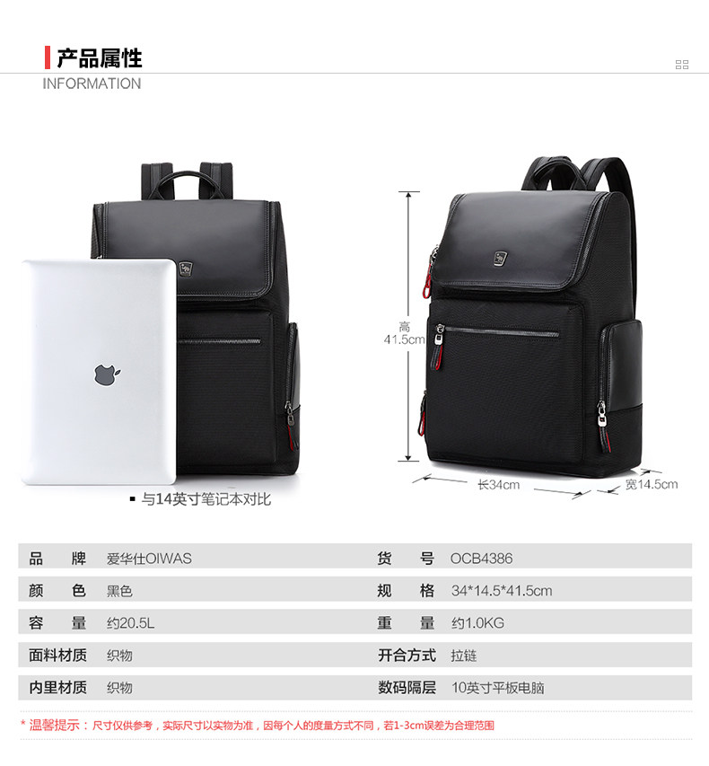 型号:OCB4386 材质:织物 尺寸: 340*145*415mm 颜色:黑色