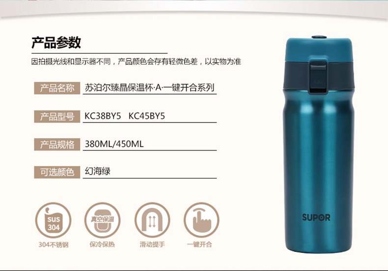 商品名称:苏泊尔臻晶保温杯A.一键开合幻海绿 KC38BY5/KC45BY5 450ml商品编号:27531531109店铺: 丝毫专卖店商品毛重:1.5kg材质:其它类型:居家分类:创意杯子适用人群:送爱人,送朋友,送领导,送儿童,送长辈,送客户适用场景:居家