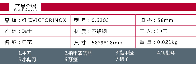 维氏VICTORINOX瑞士军刀 典范(7种功能)带便携式刀套 红色光面0.6203 此款配备小刀、指甲锉(兼附)、指甲清洁器、剪刀、钥匙环、牙签、镊子等7种功能,这种多功能、方便及耐用的小刀有着广泛的用途:旅行、登山、潜水及航模运动、修理自行车、汽车和其它业余爱好都能让其发挥作用,瑞士军刀在紧急时刻,危险关头也常是个好帮手。追求品质是瑞士军刀的一贯传统,多年的发展使其每个组成部分都达到了造型与功能的合理结合,并受到众多瑞士维氏军刀拥簇者的喜爱。