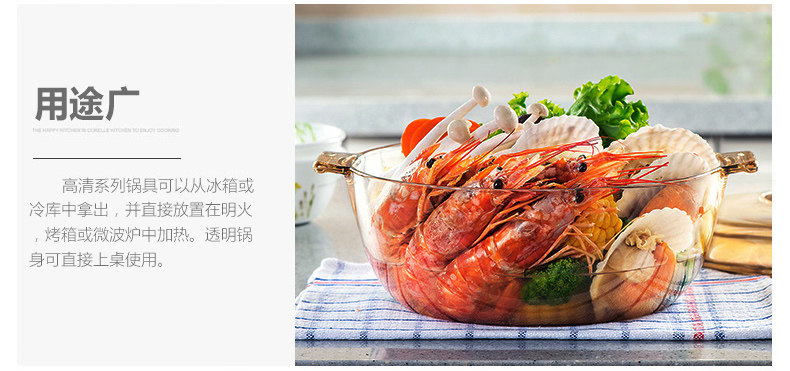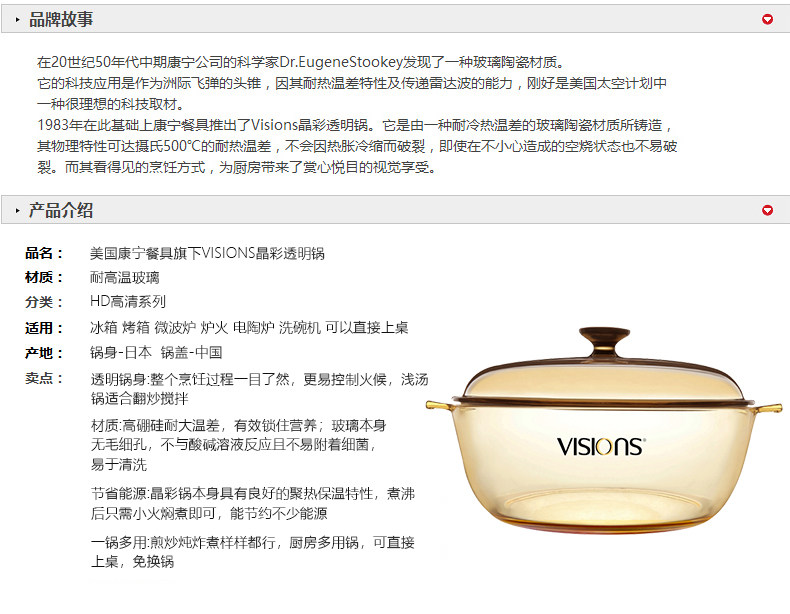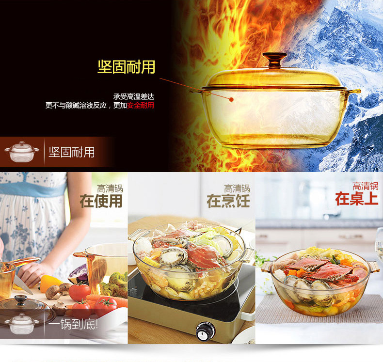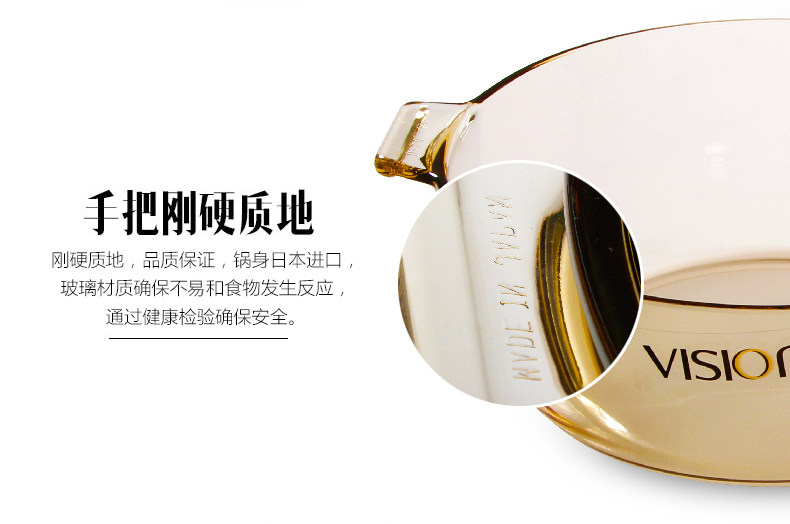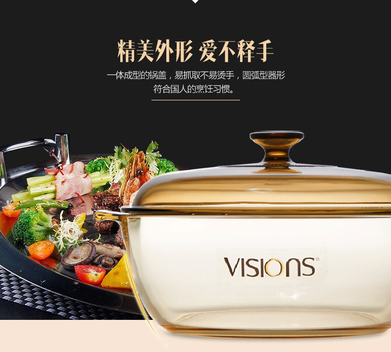 品牌:VISIONS(美国康宁 晶彩透明锅) 型号: VS-4L-HD 规格: VS-4L-HD 4L(经典汤锅) 材质:康宁耐热玻璃(锅盖,中国制造),康宁超耐热玻璃(玻璃陶瓷)(锅身,日本制造) 产品说明: 美国康宁是世界知名玻璃制造商。 透明玻璃锅,烹饪看得见!即冷即热,500℃耐冷热温差。用途广泛,一锅到底。坚固耐用,持久如新。 健康、环保、安全。聚热保温,节省能源。 品质保证:晶彩透明锅锅身十年品质保证、锅盖两年品质保证