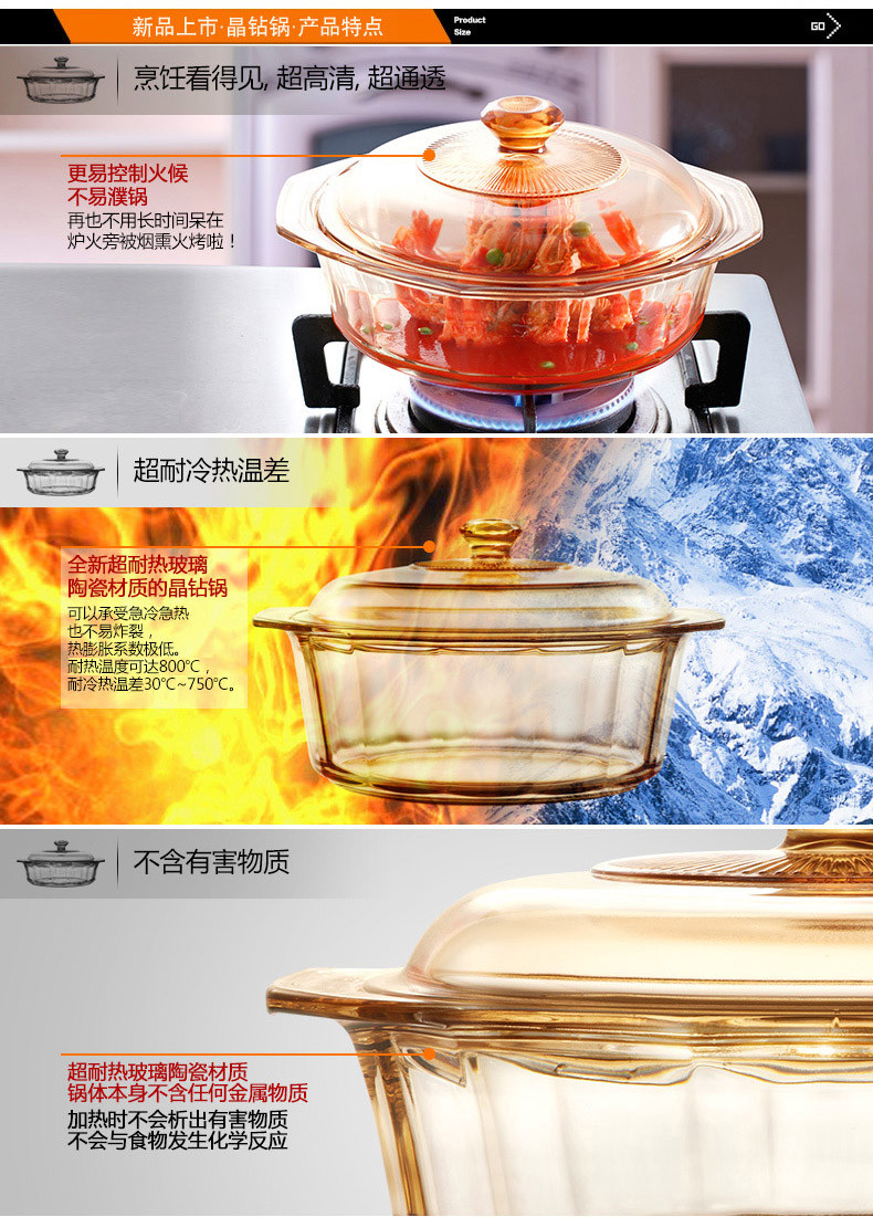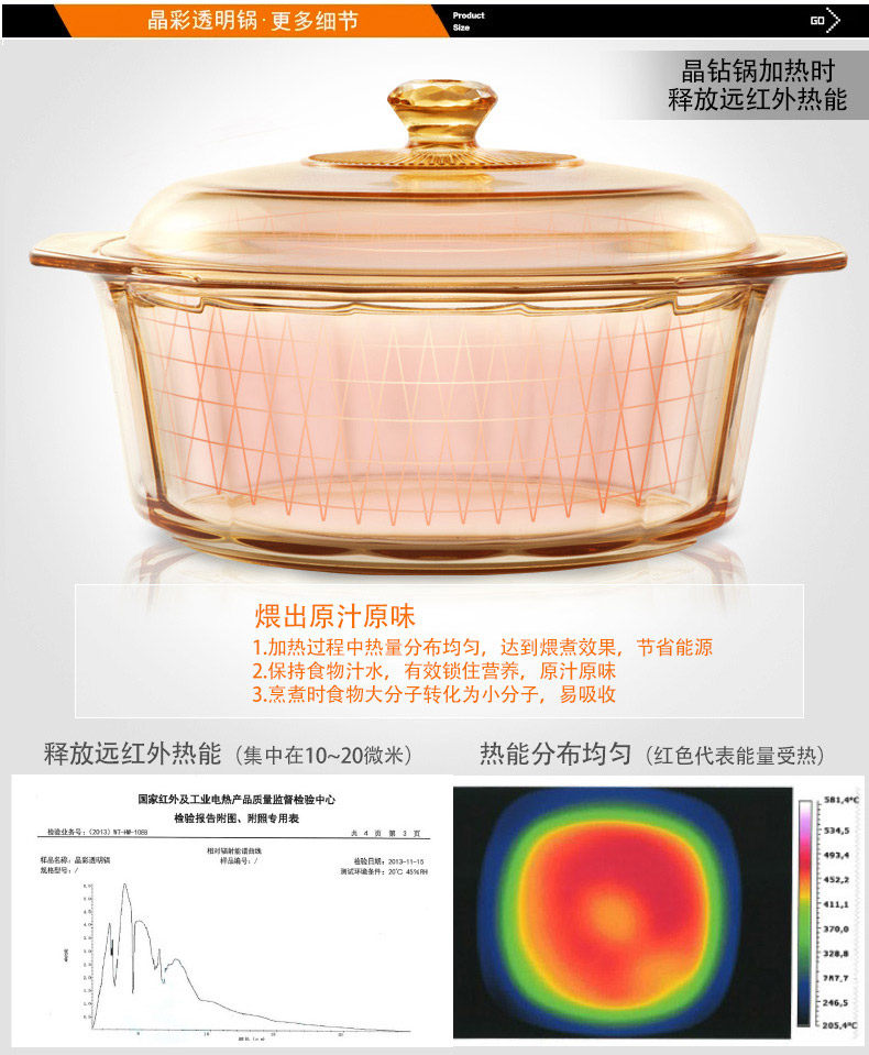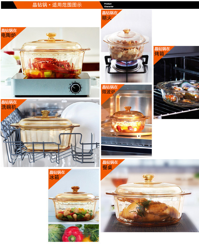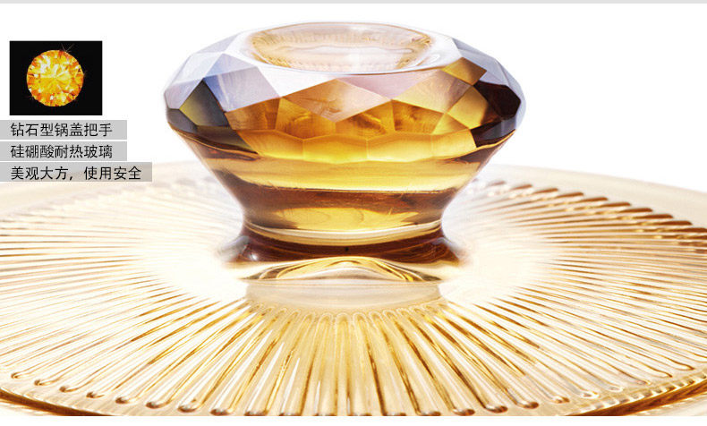 品牌:VISIONS 型号:VS-41-DI 规格: VS-41-DI 4.1L 材质:康宁耐热玻璃(锅盖,中国制造),康宁超耐热玻璃(玻璃陶瓷)(锅身,日本制造) 产品说明: 美国康宁是世界知名玻璃制造商。 透明玻璃锅,烹饪看得见!即冷即热,500℃耐冷热温差。用途广泛,一锅到底。坚固耐用,持久如新。 健康、环保、安全。聚热保温,节省能源。 钻石锅身折射红外线煨熟食材,营养保留 更加丰富 品质保证:晶彩透明锅锅身十年品质保证、锅盖两年品质保证