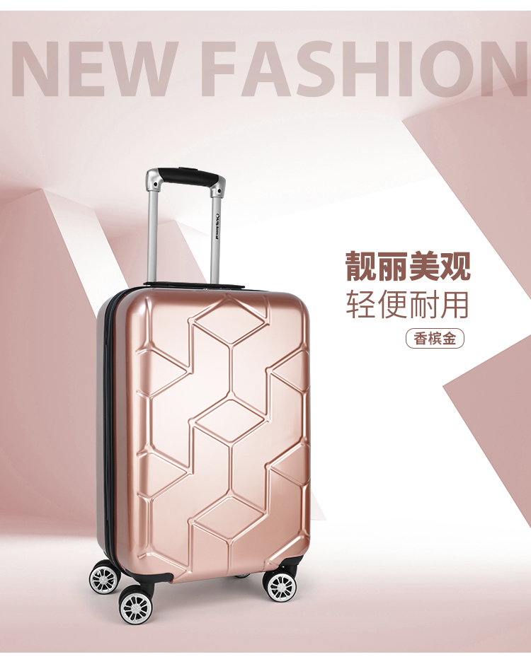 可登机拉杆箱 ●产品采用先进工艺科学,箱体采用了PC+ABS材质制作而成,具有抗冲击性、耐磨等优点。 ●优质拉杆,轻便经久耐用。 ●360°旋转轮,可前推后拉左右平移,轻便灵动,旅行省心省力 ●高品质的海关防盗锁,让您的旅行更轻松