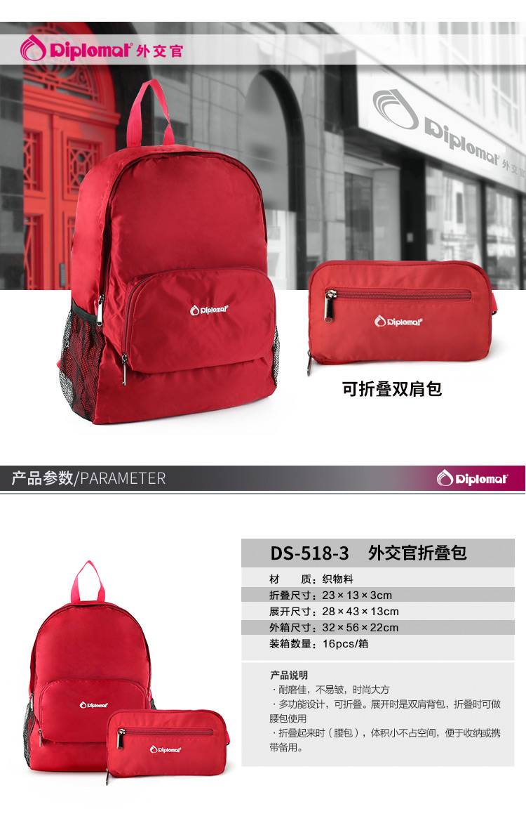 ●耐磨佳,不易皱,时尚大方; ●多功能设计,可折叠。 展开时是双肩背包,折叠时可作腰包使用; ●折叠起来时(腰包),体积小不占空间,便于收纳或携带备用。