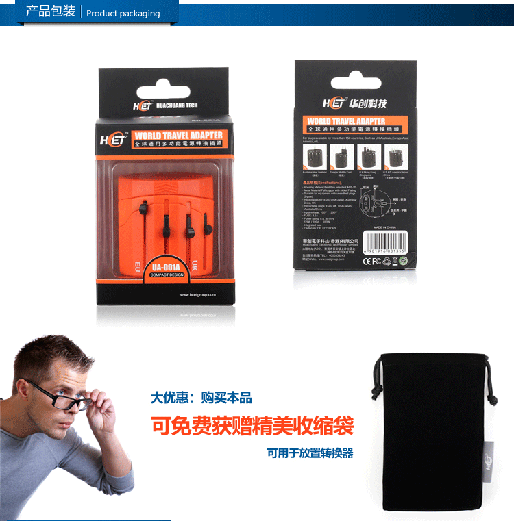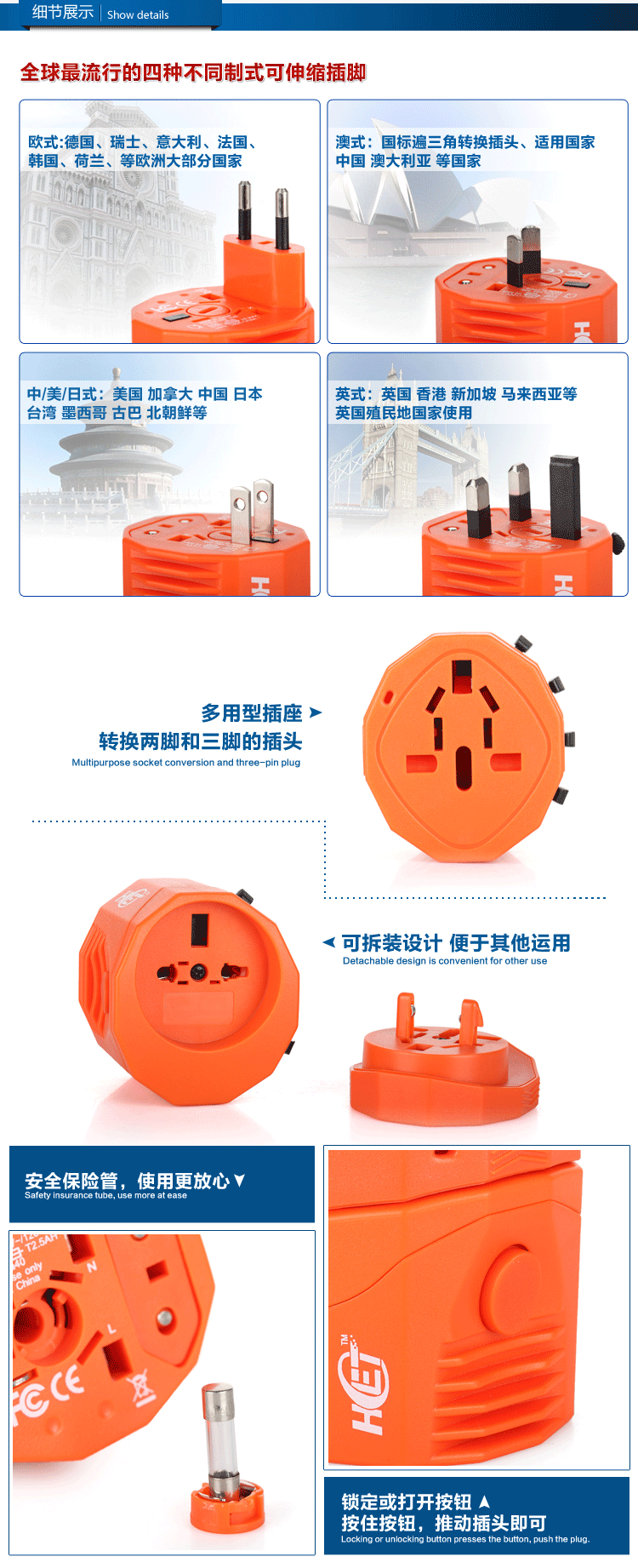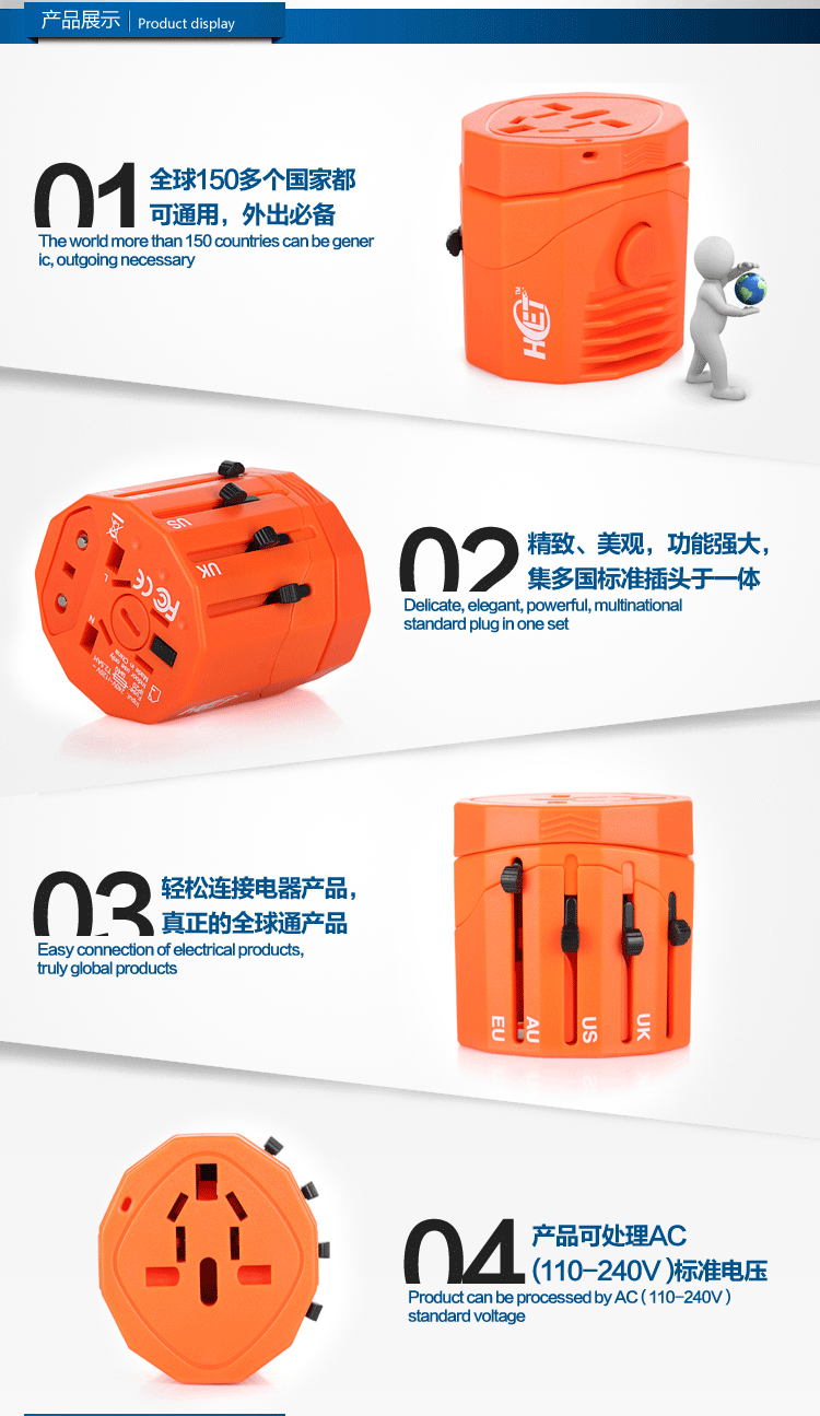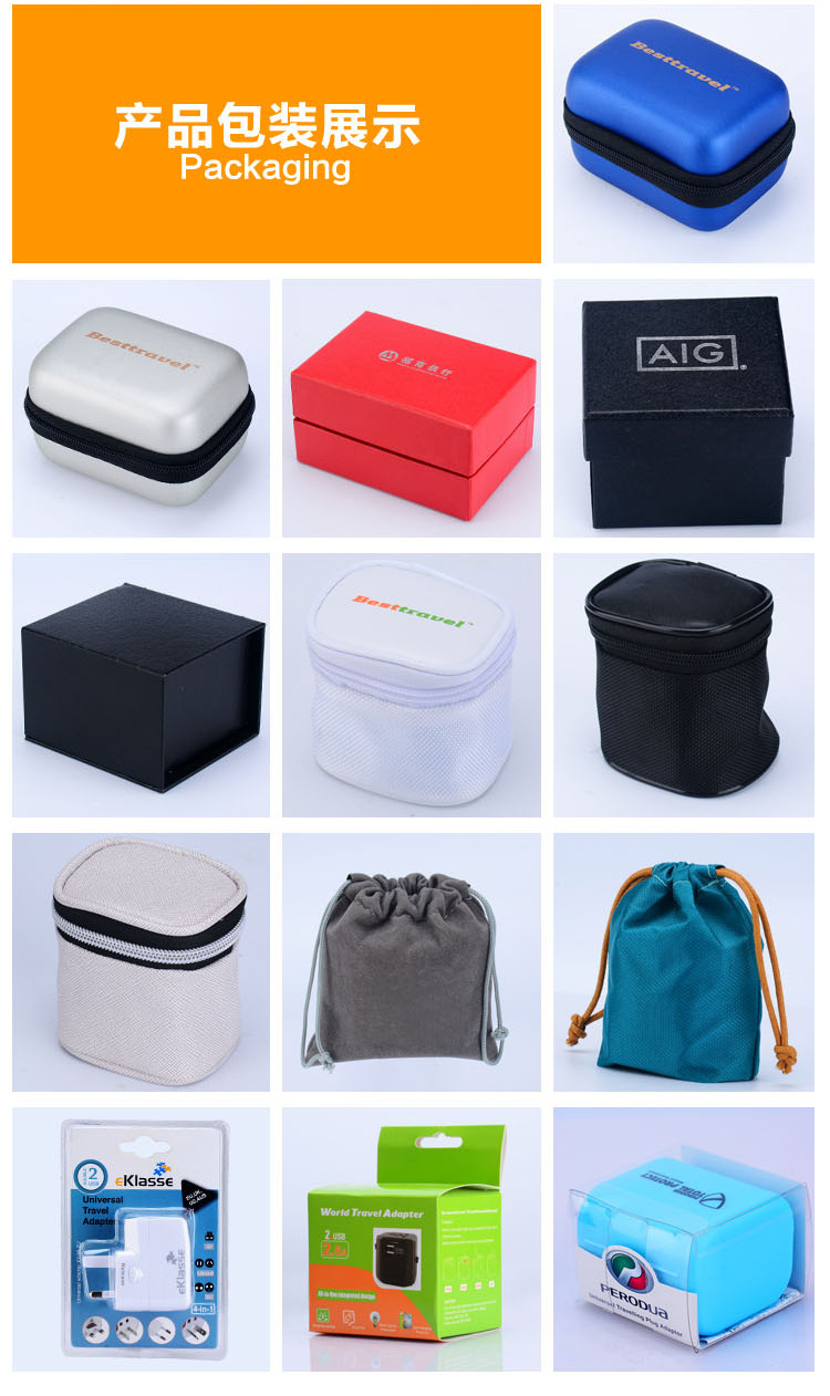 尺寸:57*52*60mm 材质:PC+纯铜 重量:107g 包装:说明书+白盒 装箱数量:100PCS/箱 外箱尺寸:34.5*32*30cm 产品说明: 欧规美规英规澳规四种不同制式插脚,随意转换,适合全球大部分国家使用 电源输入:AC100~250V 小体积 大智慧,便携式旅行转换插头 技术细腻,完美整合4种插头 轻型材料,小巧便携,经典数码礼品首选 AC电源最大可承受5A