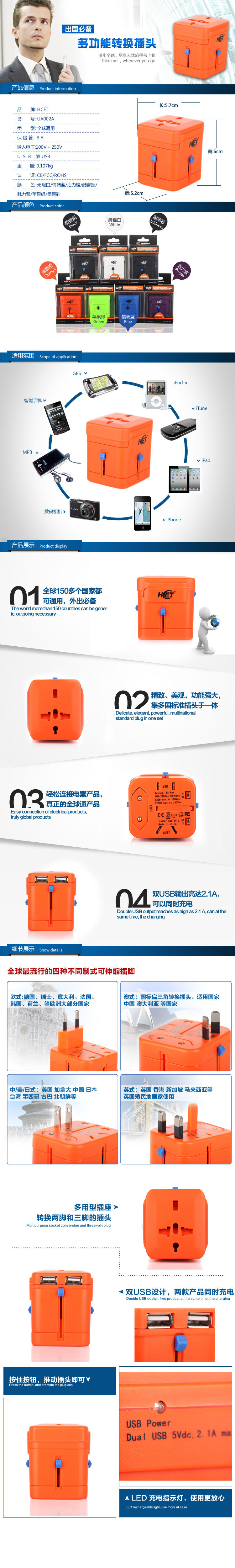 尺寸:60*65*66mm 材质:PC+纯铜 重量:115g 包装:说明书+白盒 装箱数量:100PCS/箱 外箱尺寸:34.5*32*30cm 产品说明: 欧规美规英规澳规四种不同制式插脚, 随意转换,适合全球大部分国家使用 电源输入:AC100~250V 双USB 5V 2.1A 完美适配数码产品,搭载8A 高品质保险丝更安全。 商务精英礼品首选(支持OEM)。