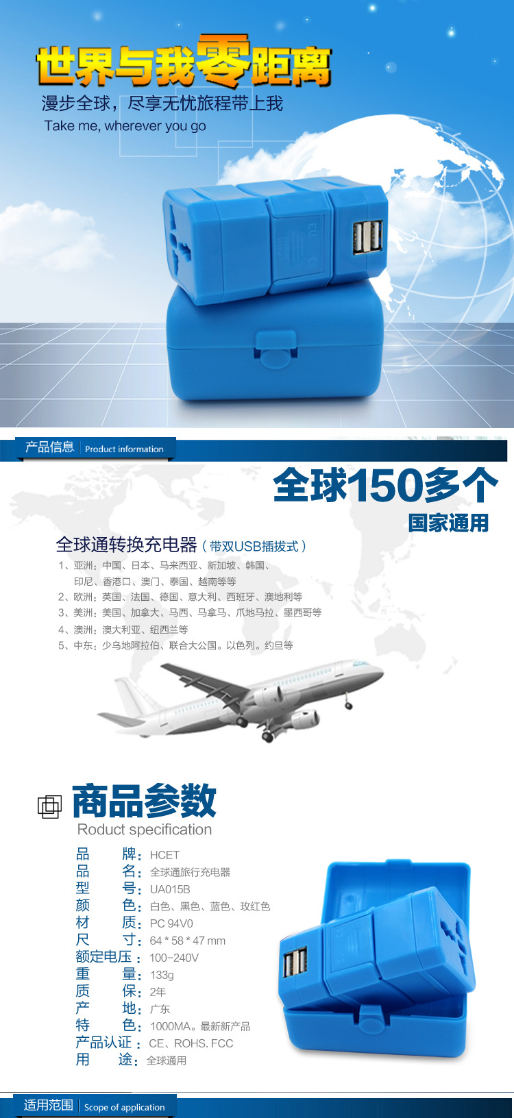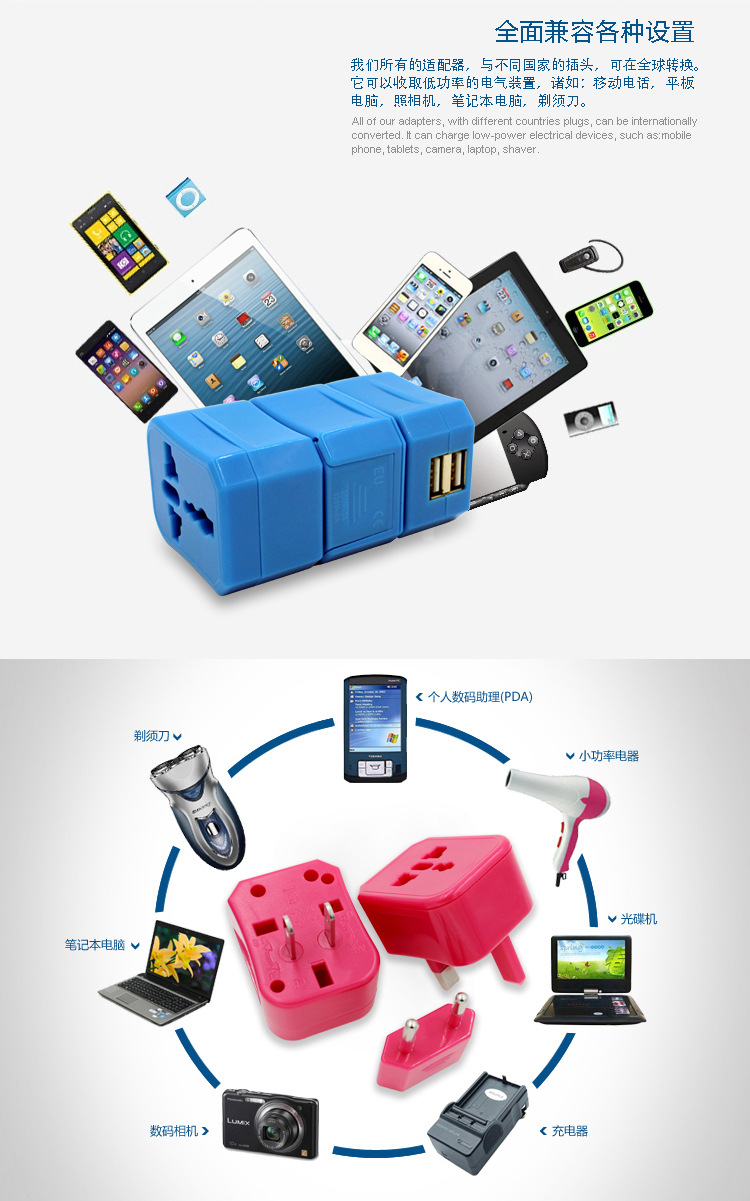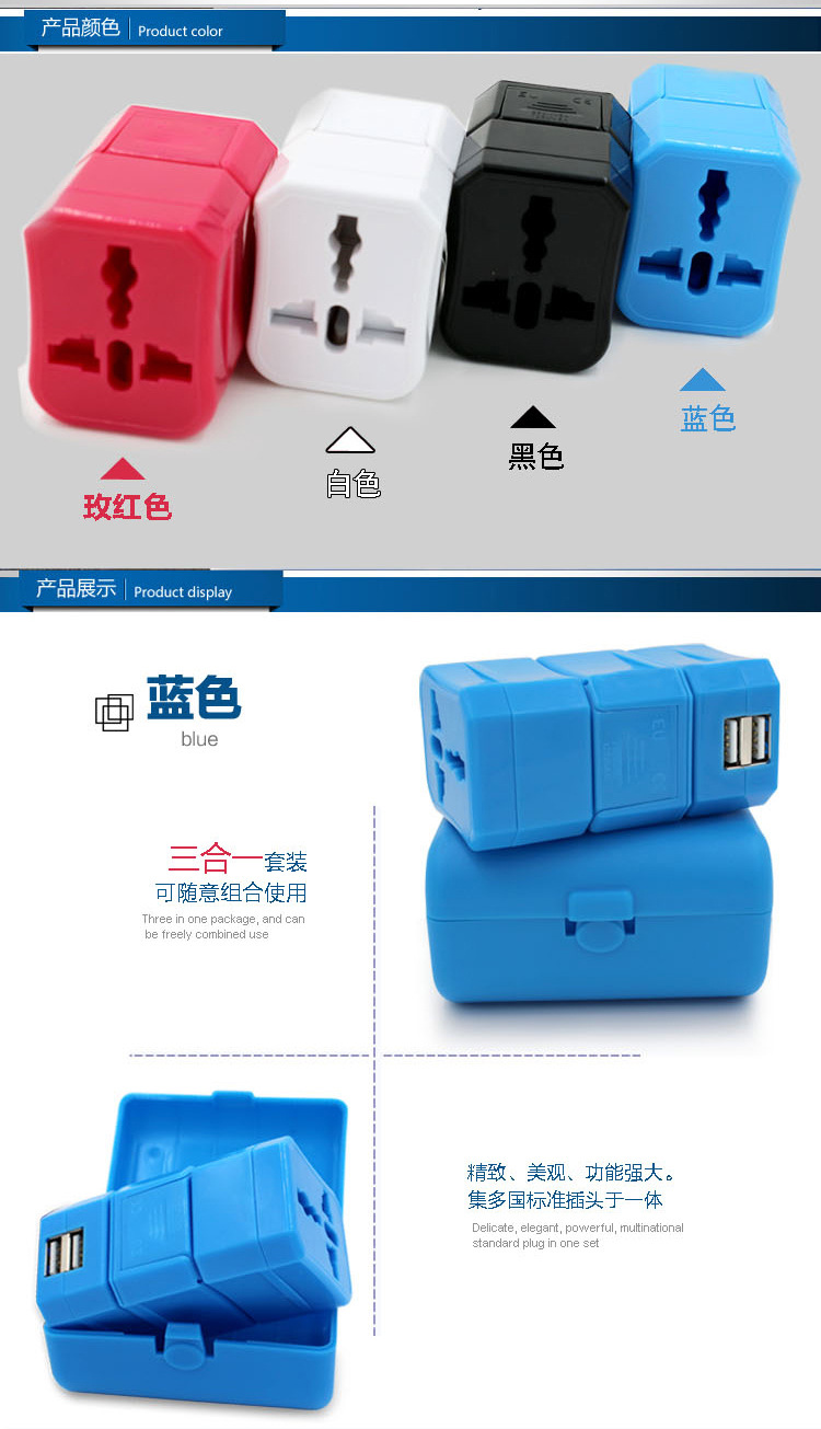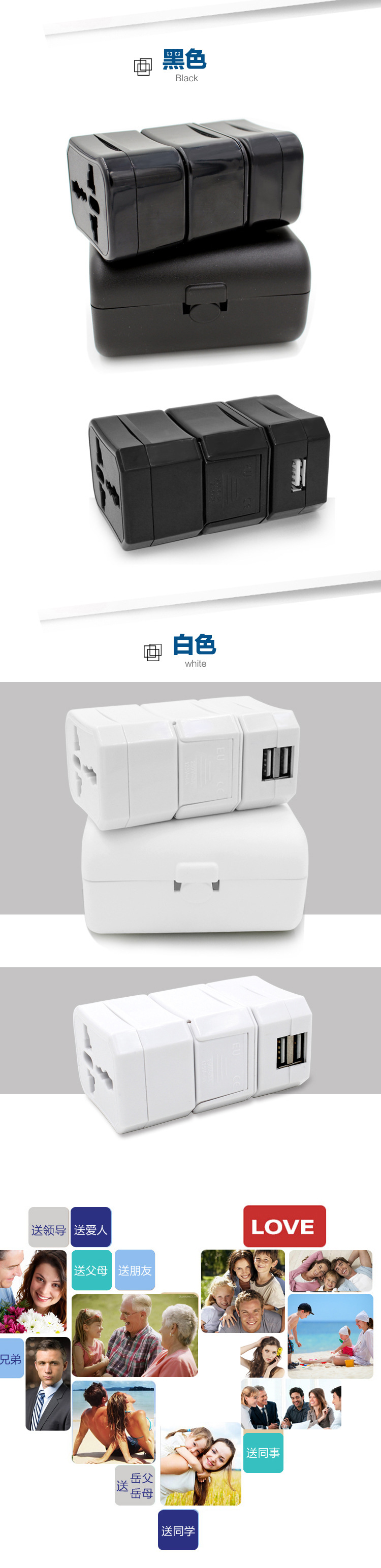起订量:500PCS 尺寸:88*55*45mm 材质:PC+纯铜 重量:145g 包装:说明书+白盒 装箱数量:100PCS/箱 外箱尺寸:34*32*28cm 产品说明: 欧规美规英规澳规四种不同制式插脚,随意转换,适合全球大部分国家使用 电源输入:AC100~250V AC电源最大可承受6A,多色可选 , 缤纷数码礼品首选。轻型材料,小巧便携,3合1 组合,更适合旅行需求 双USB充电 5V 1A