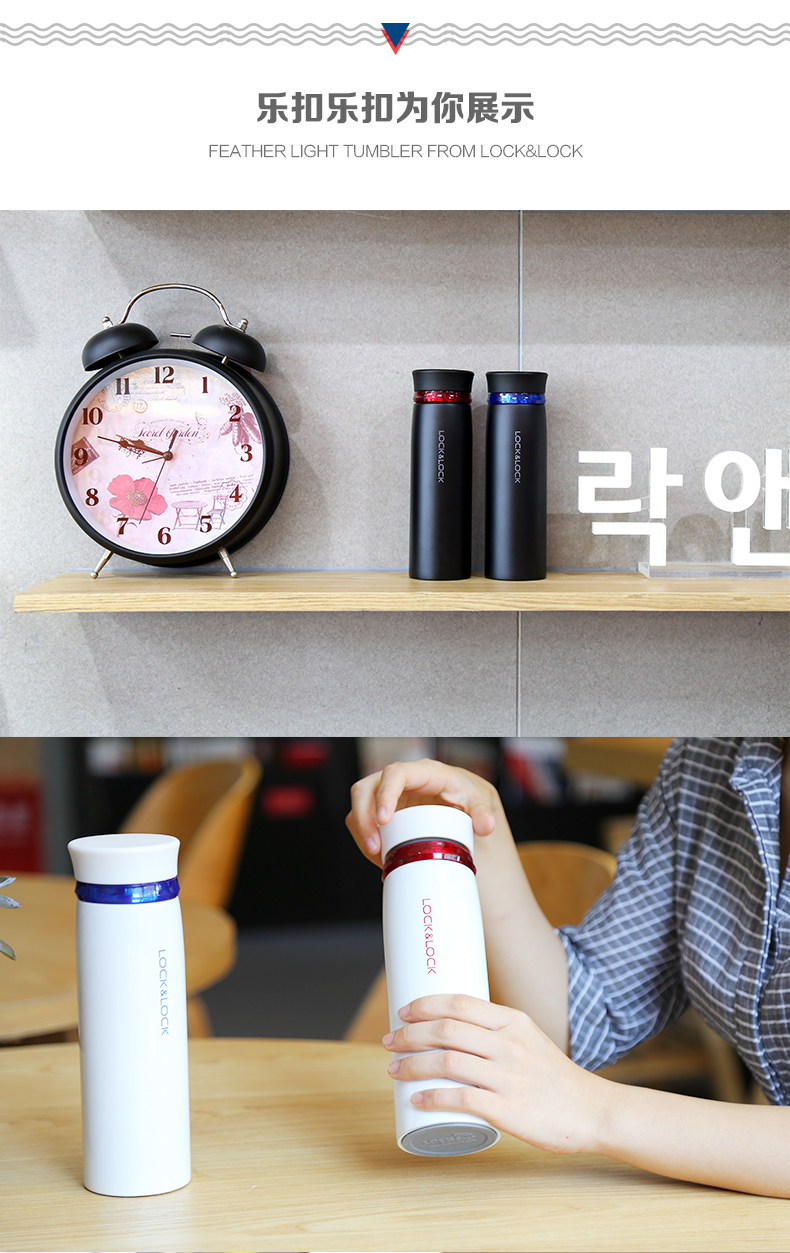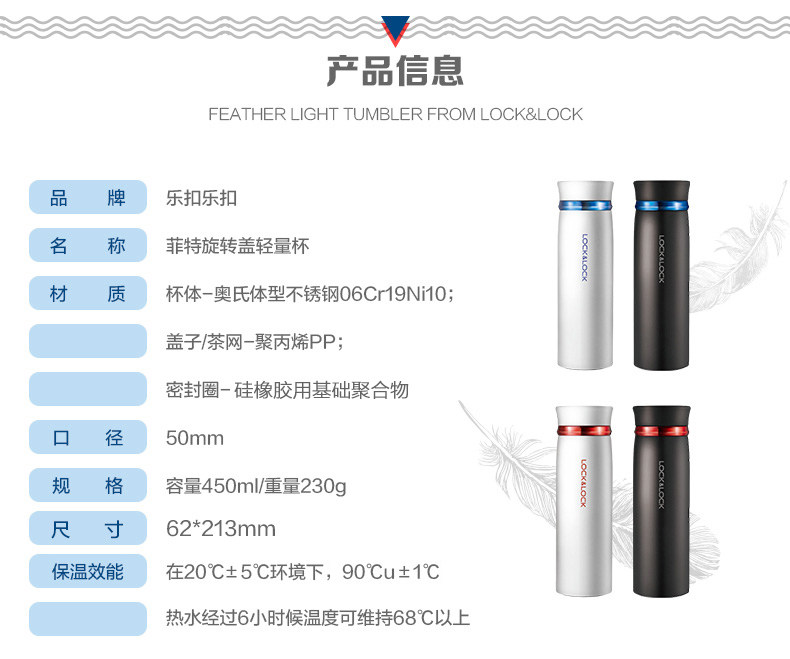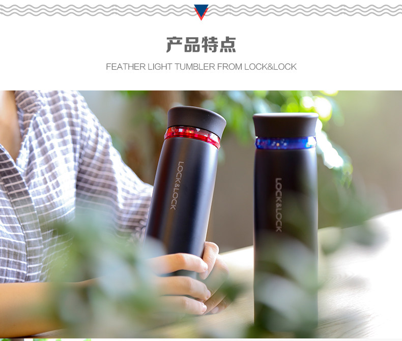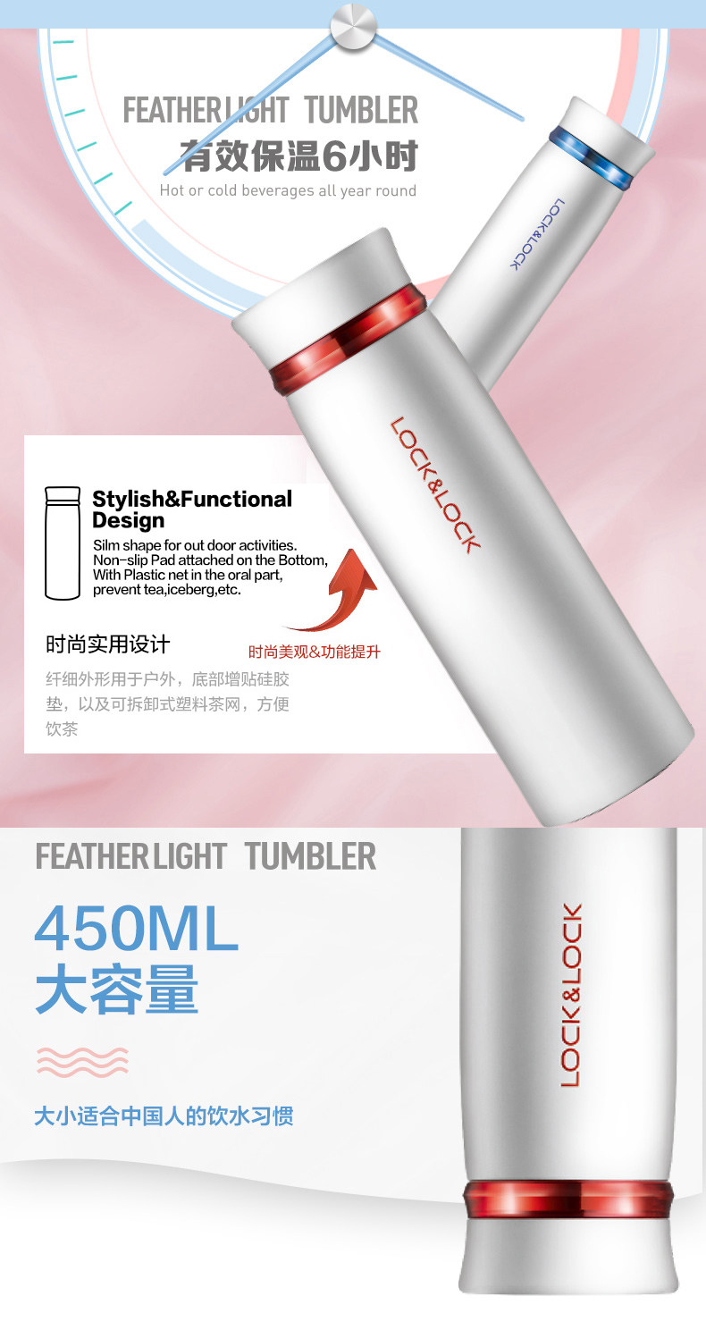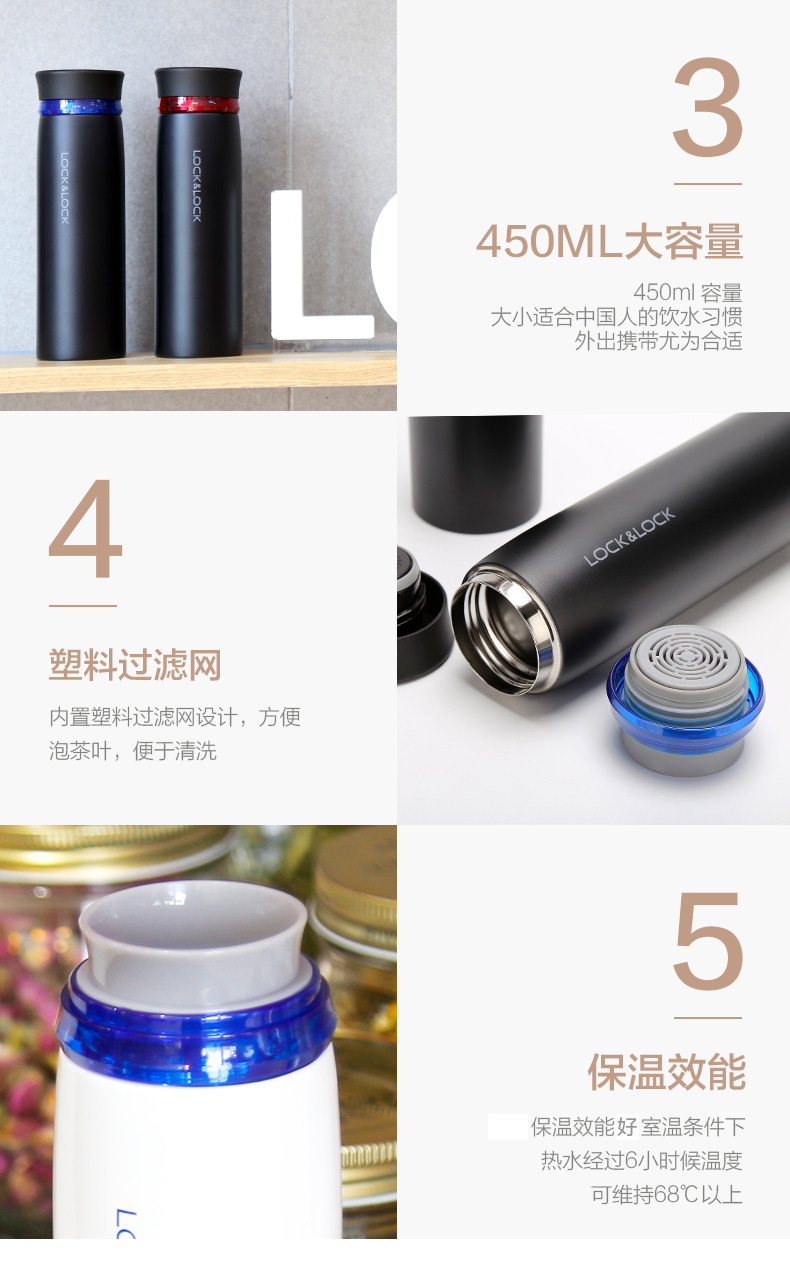 1.分离式盖子结构,清洗方便 2.茶网设计,有效阻隔茶叶、冰块等内容物 3.400ml, 230g -> 增加容量,减少重量 4.内胆外壁镀铜,先进的抽真空技术,保温效果更加持久 5.在20℃±5℃环境下,99℃±1℃热水经过6小时 后温度可维持60℃以上