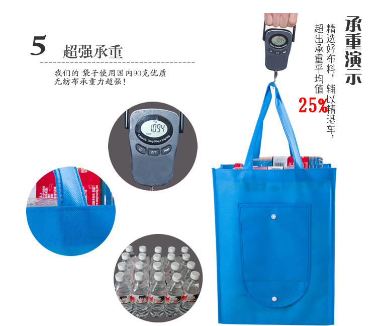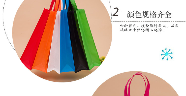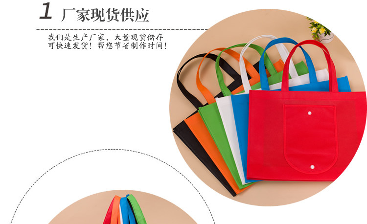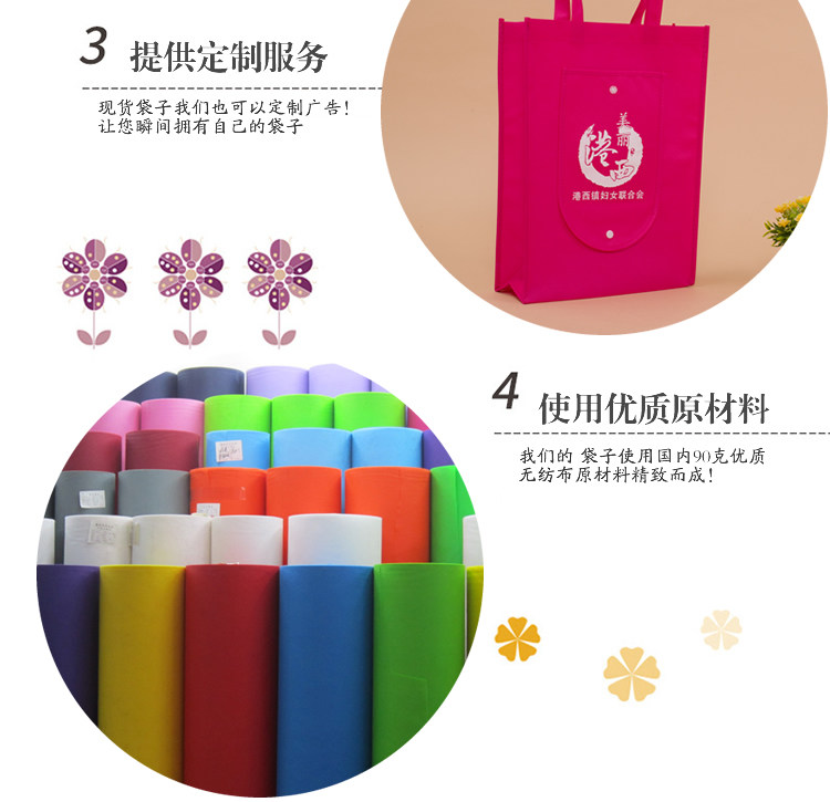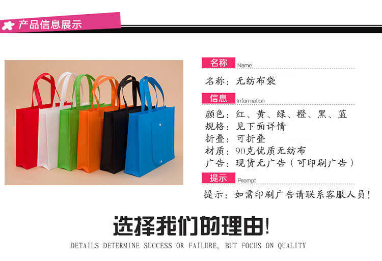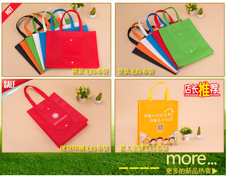 品 名: 折叠无纺布袋. 材质厚度:无纺布. 尺 寸: 32宽*40高*10侧边CM,手提48*2.5CM 做 工: 手工车缝,折叠钱包款式. 印 刷: 三色单面丝印. 起 订量: 1000只起订 包装方式: 纸箱包装,防水编织袋包装.