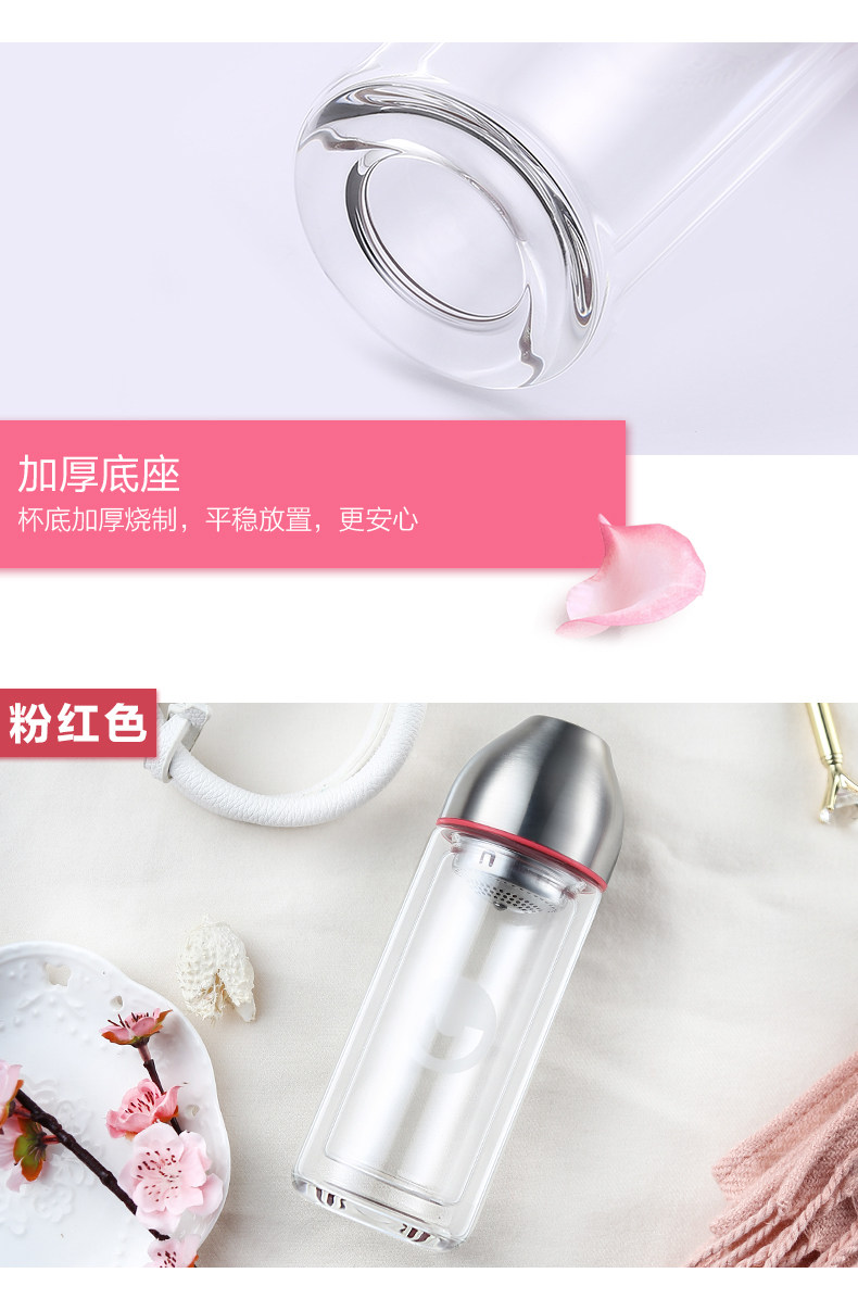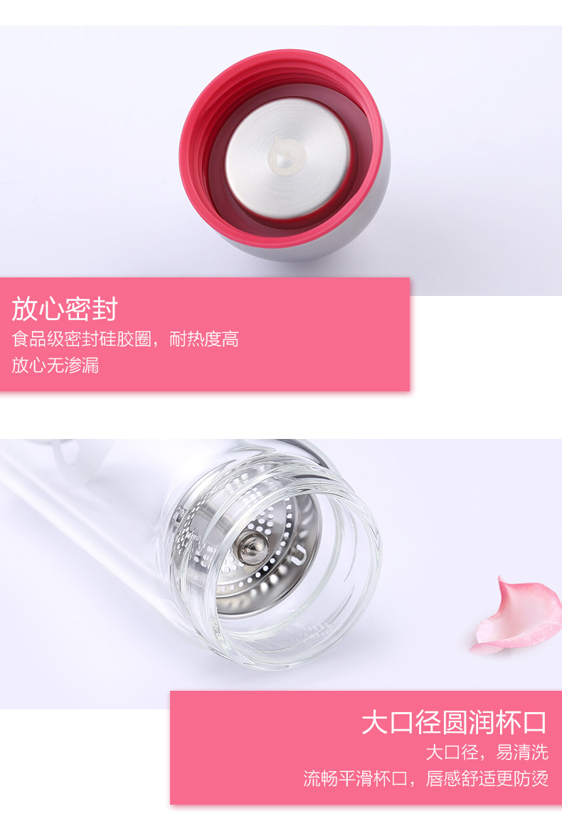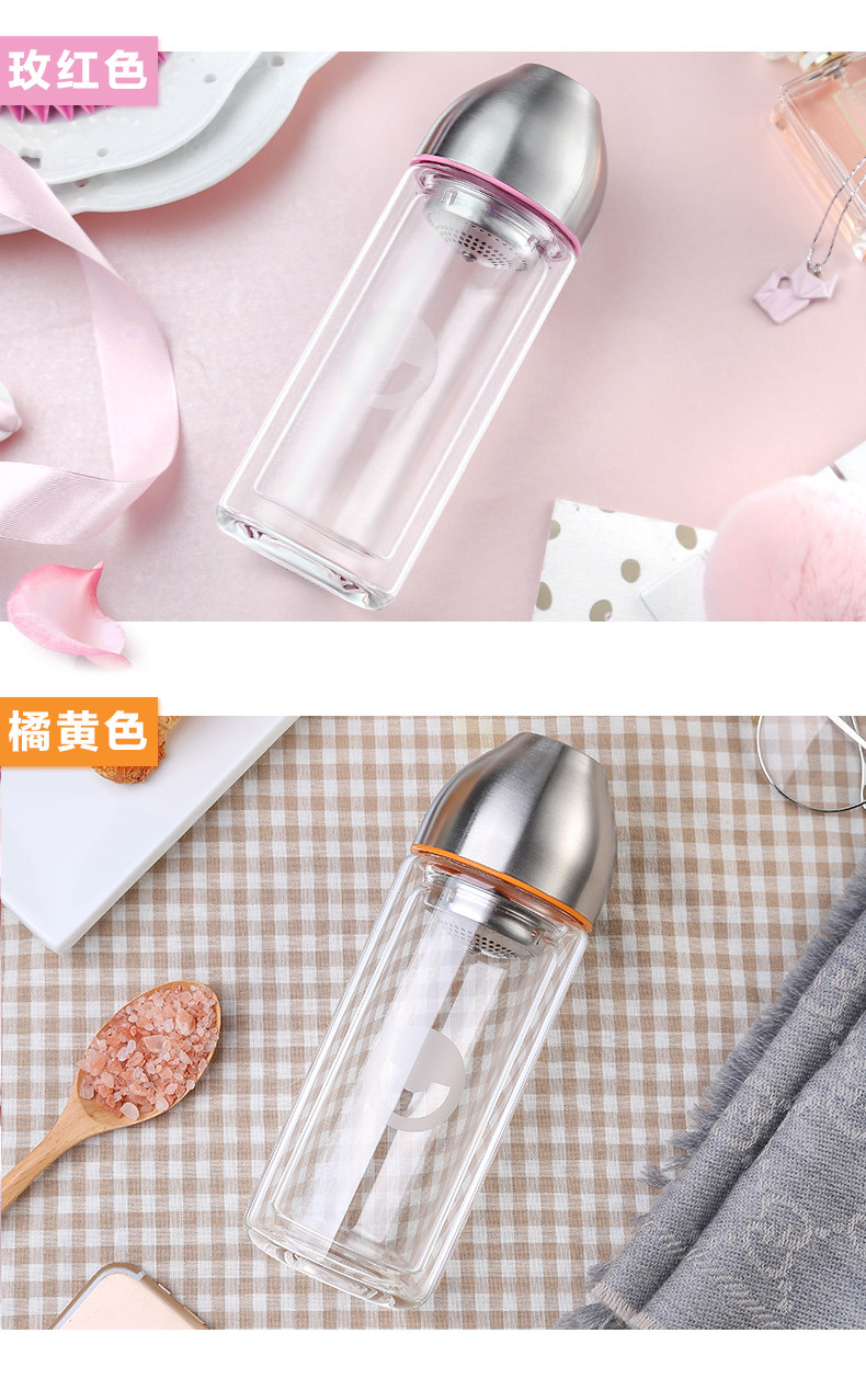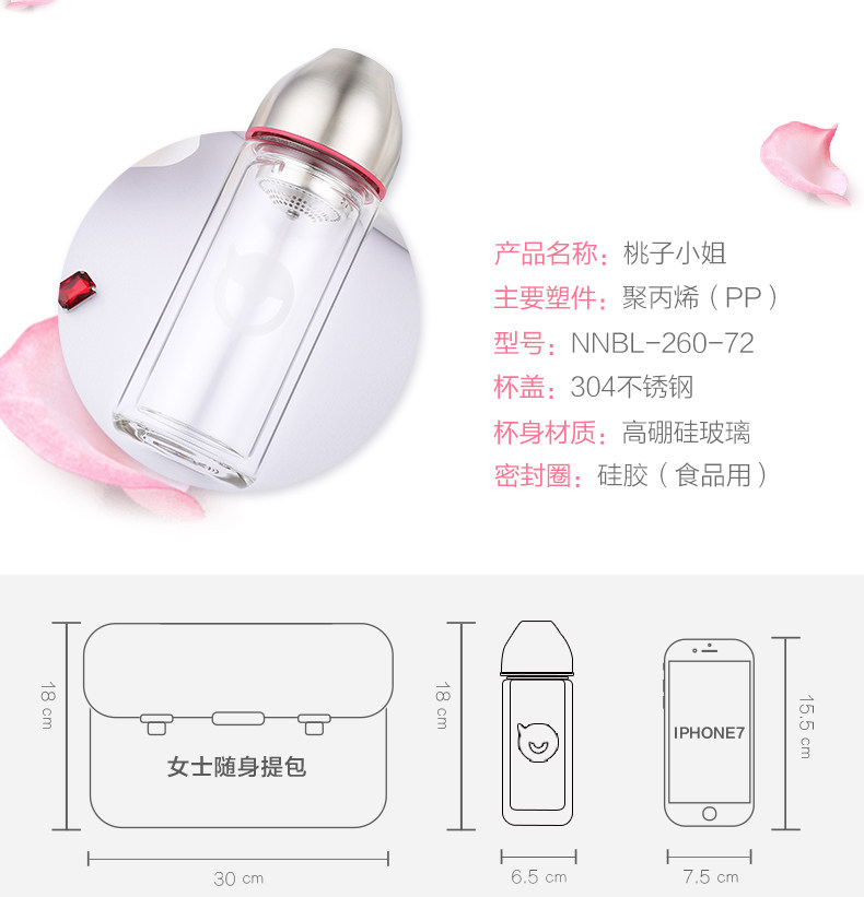 型号:HBL-260-72 尺寸: 6.6*6.6*18.6cm 容量:260mL 装箱:30个/箱 颜色: 粉色、玫红、蓝色、橙色 杯身材质:高硼硅玻璃 密封圈: 食品级硅胶