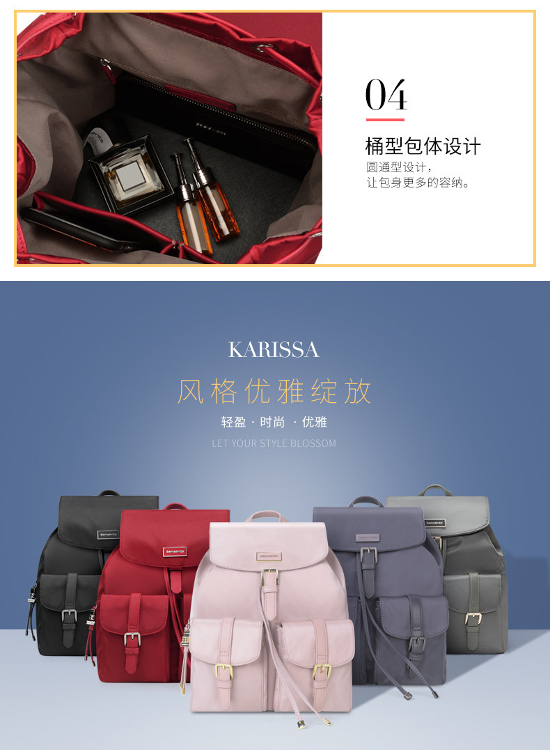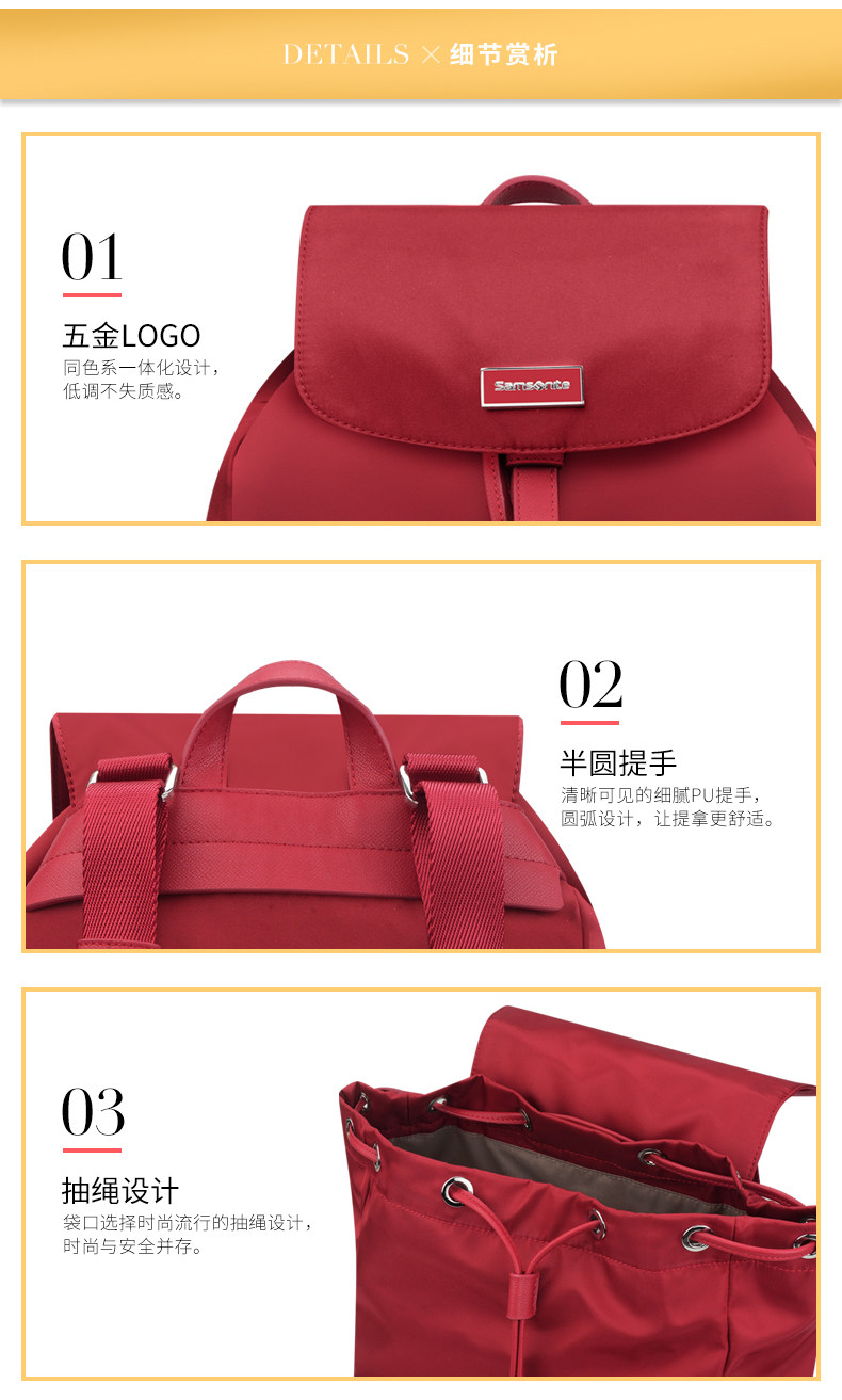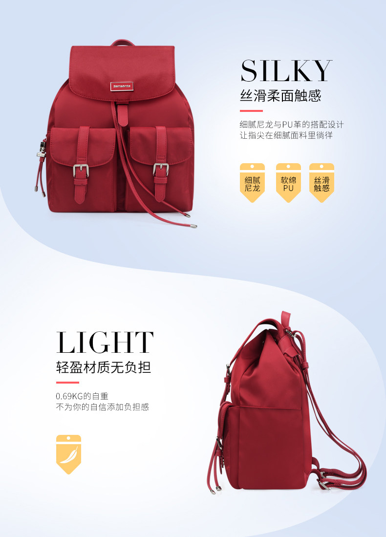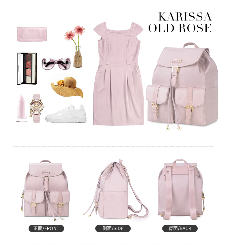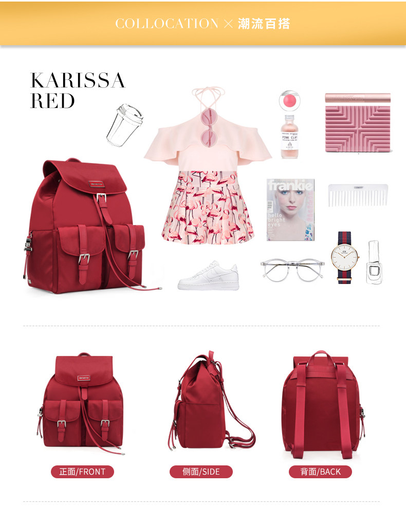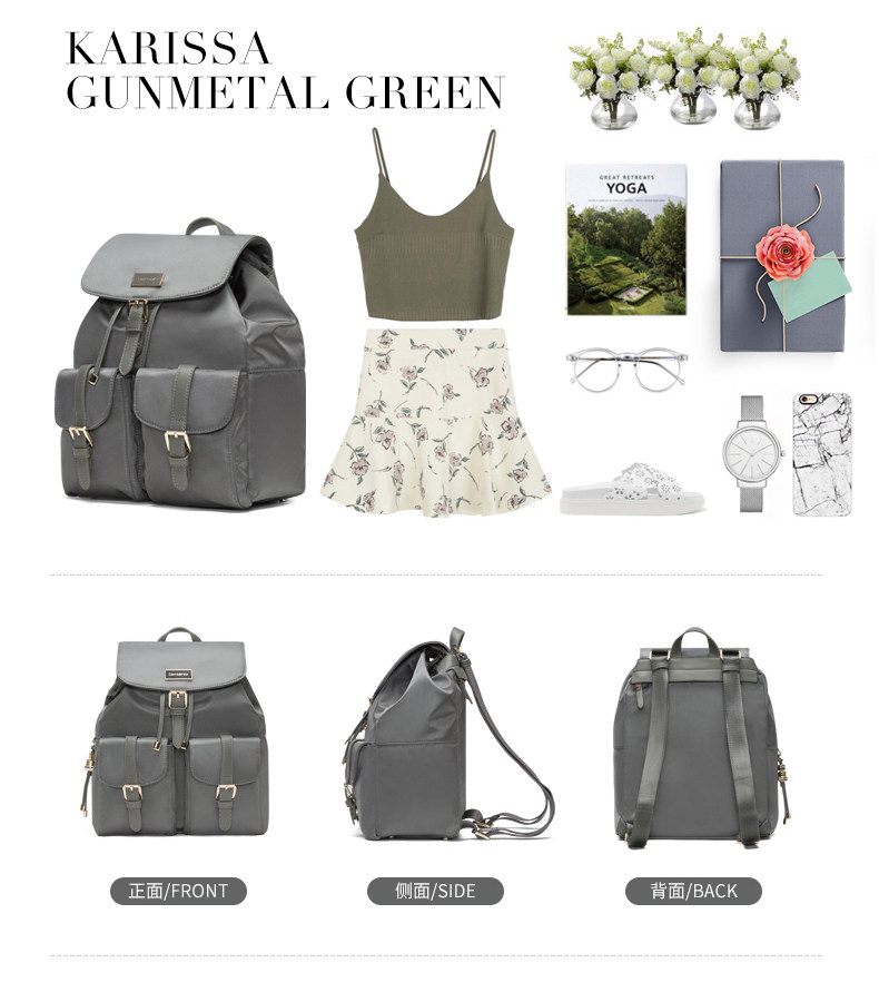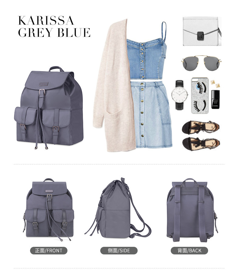 翻盖、多口袋、装饰针扣、束口绳款式流行, 最新服装面料,材质轻盈。 主袋束口绳开口方式,吸扣固定,外有金属针扣装饰, 内有贴袋,拉链袋。 前幅两侧袋盖口袋,吸扣固定,外有金属针扣装饰, 使用方便,容量大。 背幅贴身拉链袋。