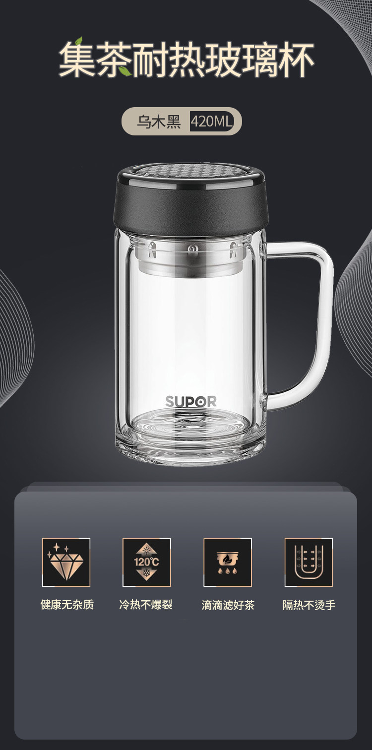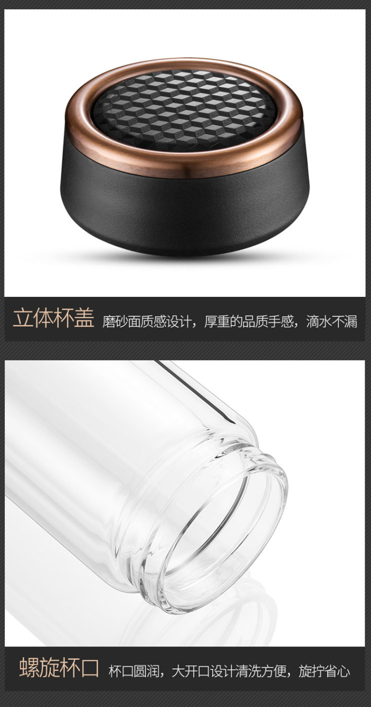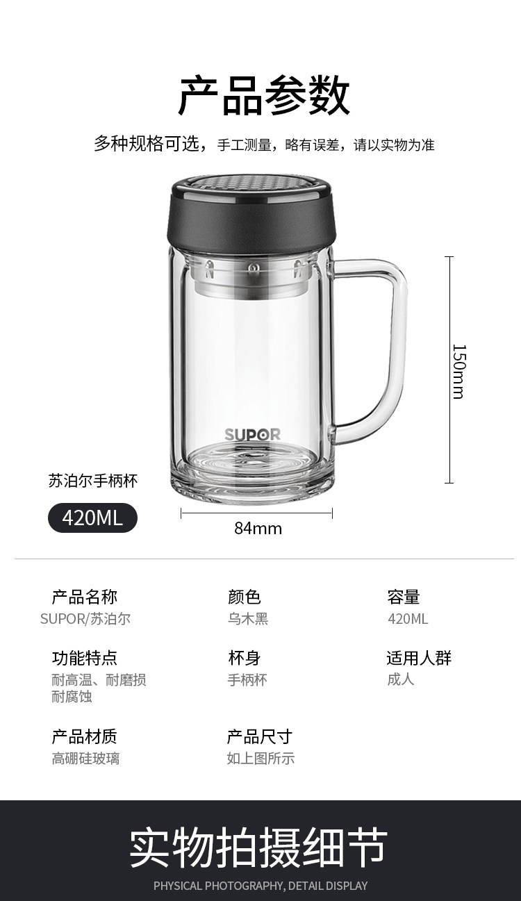 产品尺寸:136*116*182mm 装箱尺寸:600*520*230mm 装箱数量:16个 整箱毛重:12.61kg 净 重:8.80kg 容 量:420ml 单品毛重:0.79kg 净 重:0.55kg 材 质:高硼硅玻璃、304不锈钢 颜 色:楠木金/乌木黑 保温性能:120℃耐热
