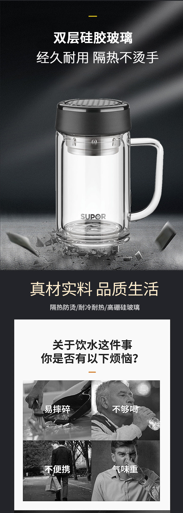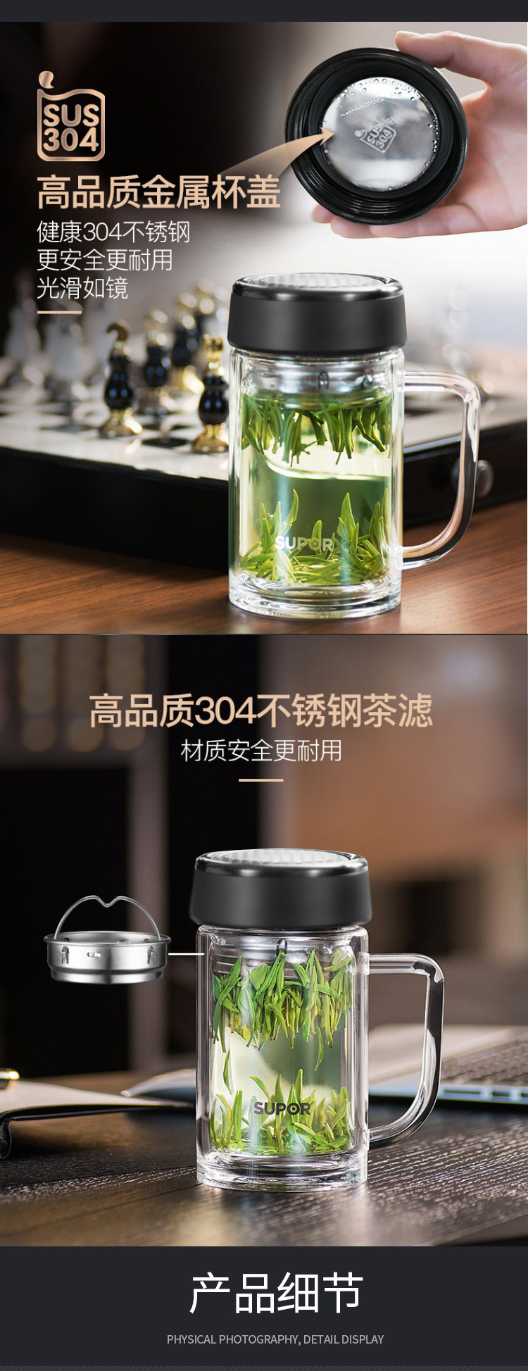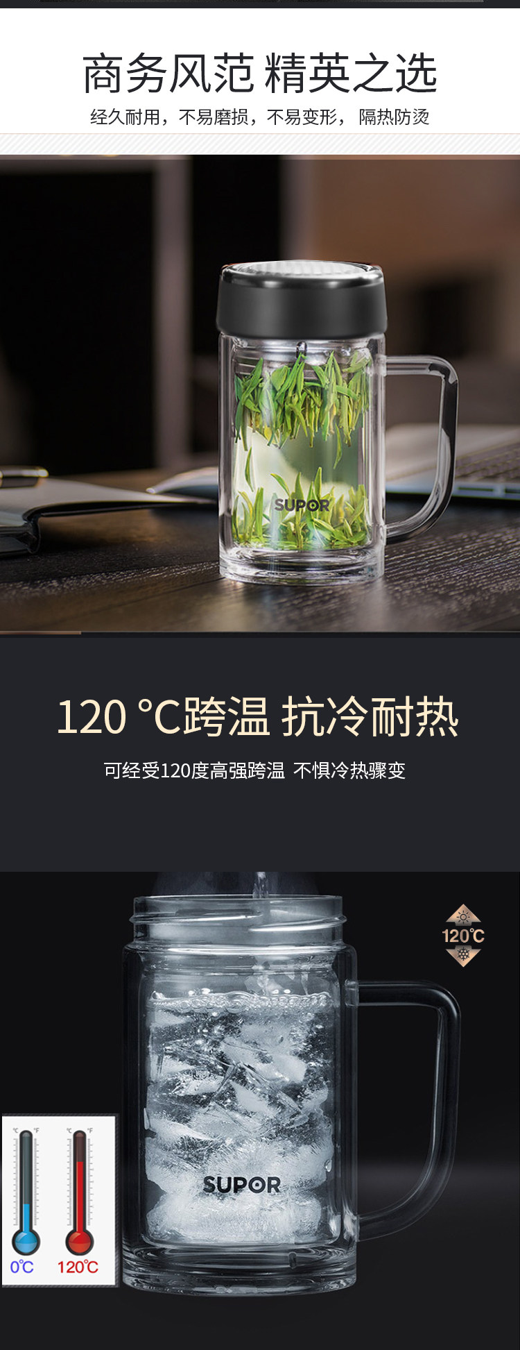 产品尺寸:136*116*182mm 装箱尺寸:600*520*230mm 装箱数量:16个 整箱毛重:12.61kg 净 重:8.80kg 容 量:420ml 单品毛重:0.79kg 净 重:0.55kg 材 质:高硼硅玻璃、304不锈钢 颜 色:楠木金/乌木黑 保温性能:120℃耐热