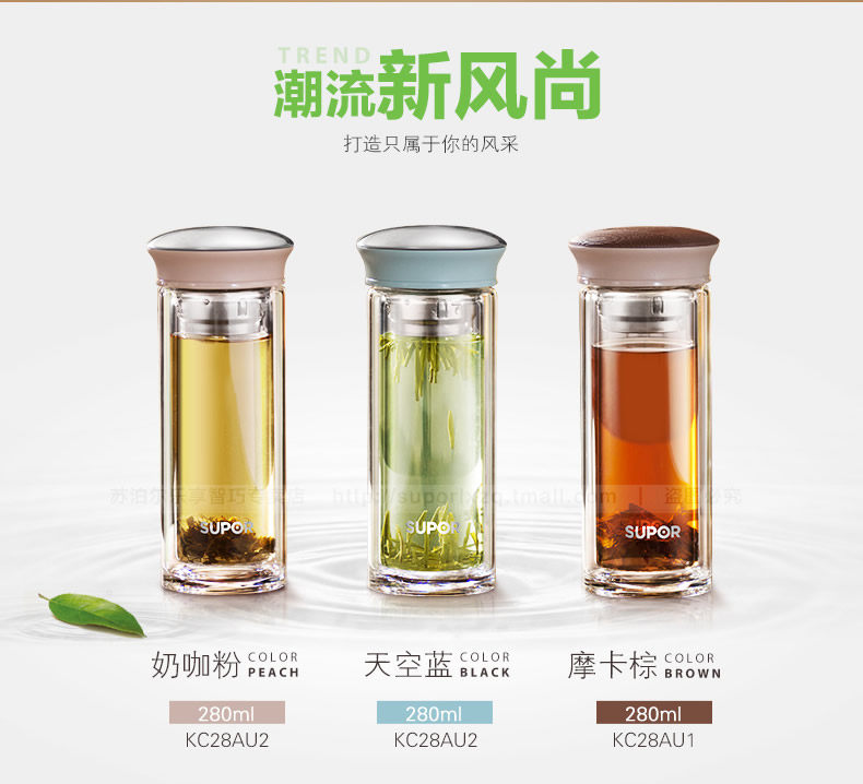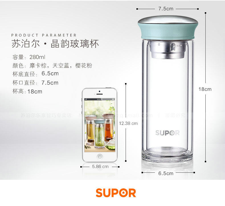 包装尺寸:209*209*227mm 装箱尺寸:670*455*260mm 装箱数量:24个 整箱毛重:12.50kg 净 重:9.19kg 容 量:280ml 单品毛重:0.52kg 净 重:0.38kg 材 质:高硼硅耐热玻璃 颜 色:摩卡棕/天空蓝/奶咖粉 保温性能:110℃高耐热